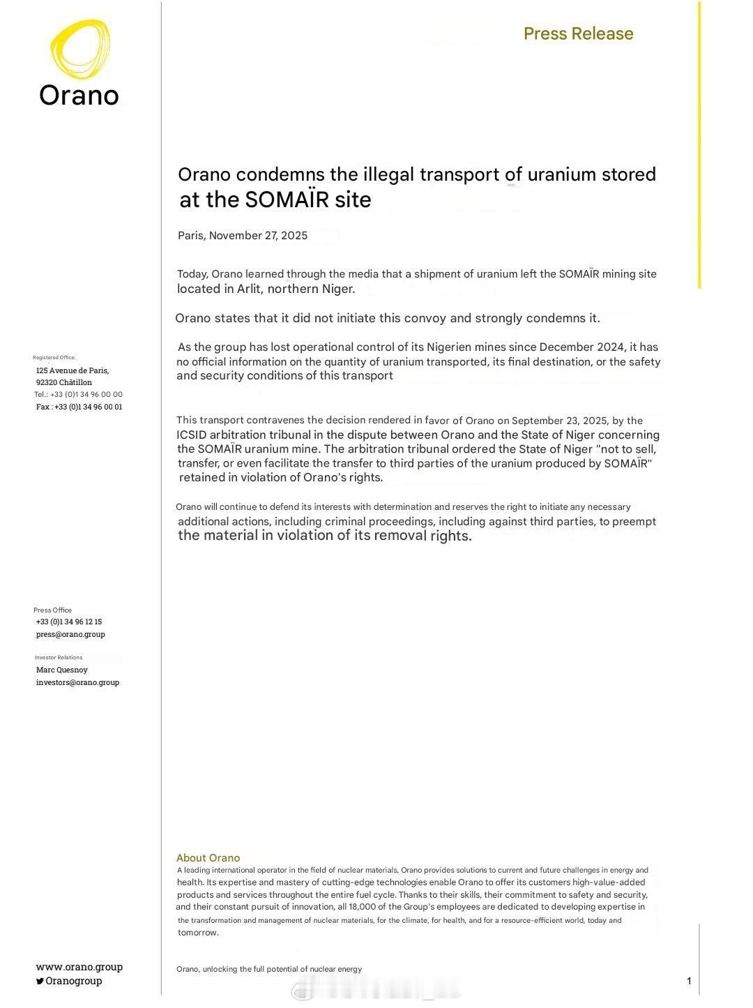 被驱逐出尼日尔的法国矿业公司奥拉诺发表声明,证实第三方(俄罗斯)已开始将数百吨铀从阿尔利特的矿场(原本是该公司控制)运往多哥洛美港,并进一步通过海运出口到俄罗斯圣彼得堡。