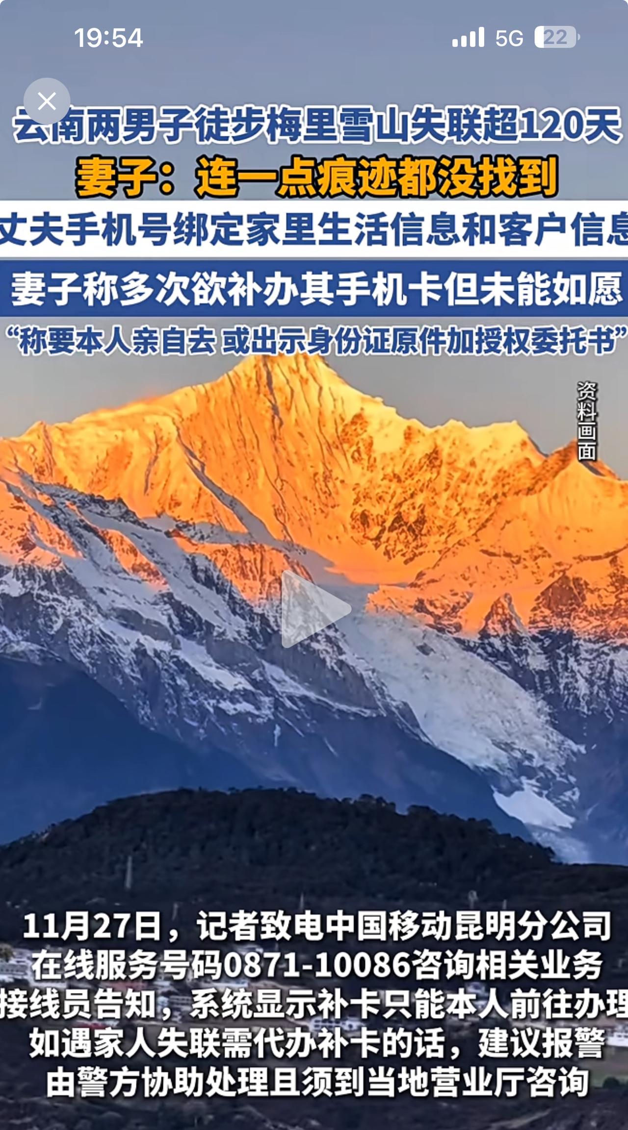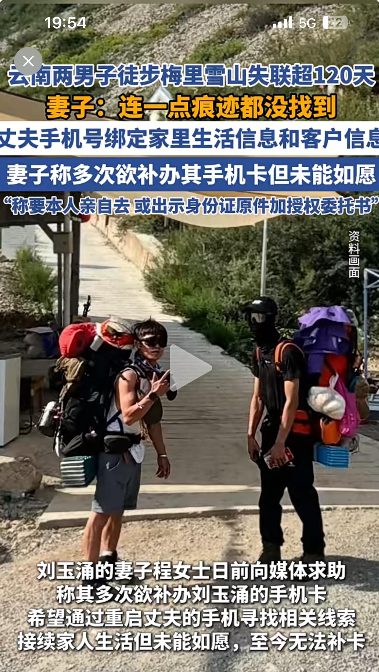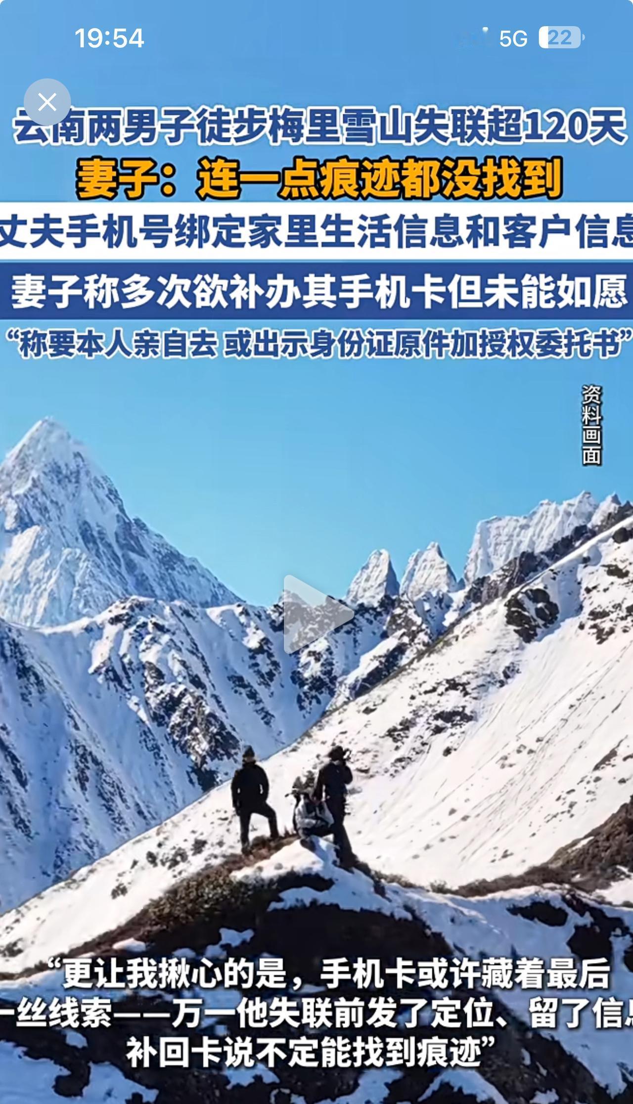 这是一起极限挑战的悲剧,两人失踪这么多天,不可能还有活着的可能。 通信公司有严格的补卡程序没有错,但是规定是死的,人是活的,特殊情况应该特殊办理。 另外,说句不好听的话,这两人野外徒步挑战对家庭极不负责任。喜欢玩极限就不要结婚!难道不知道自己意外死了,带给家庭的伤害是永久的吗?