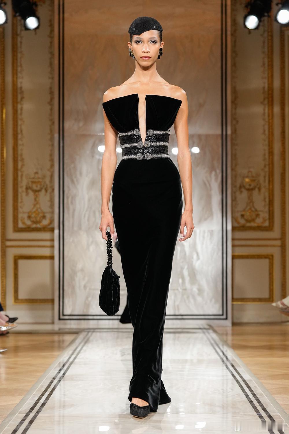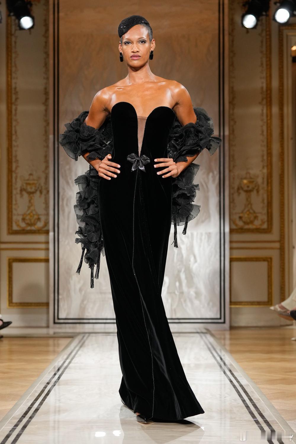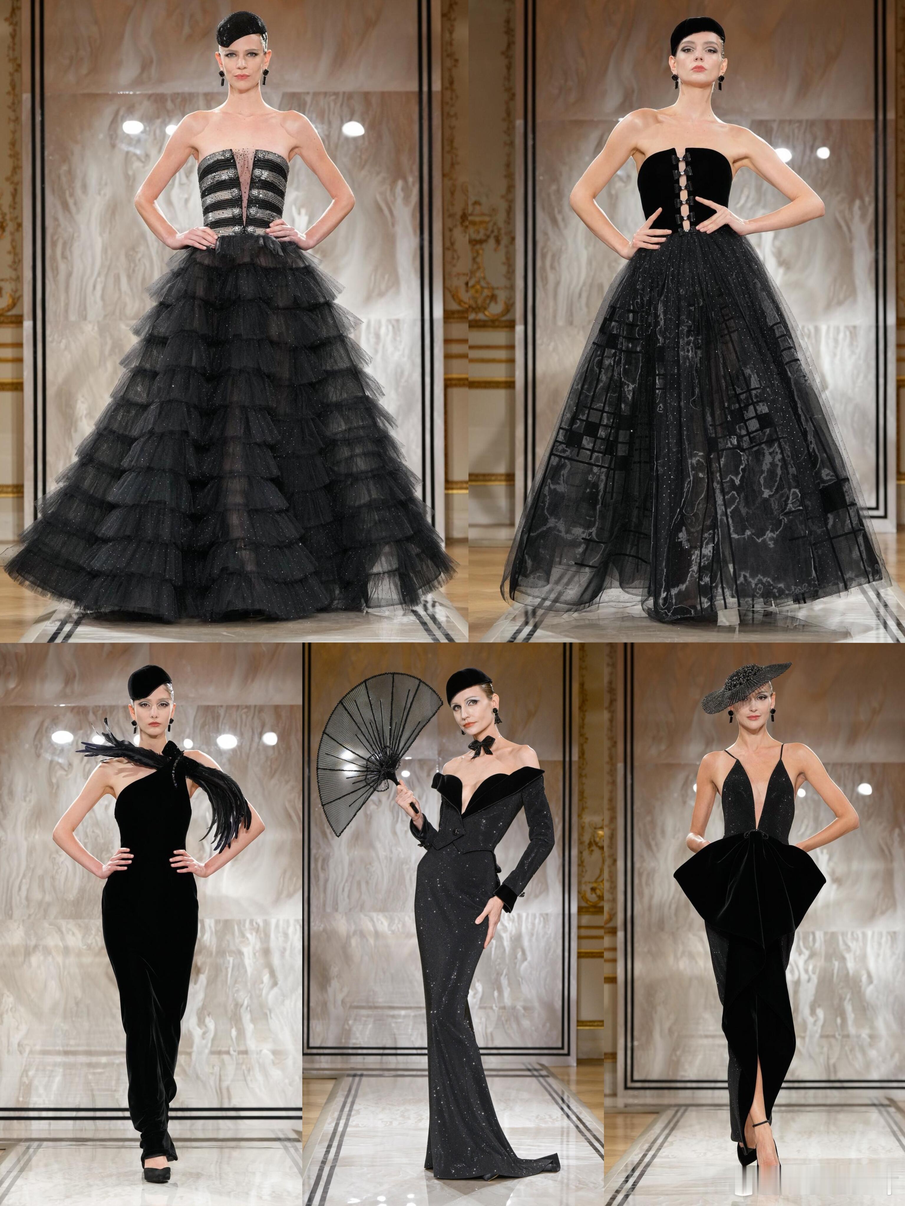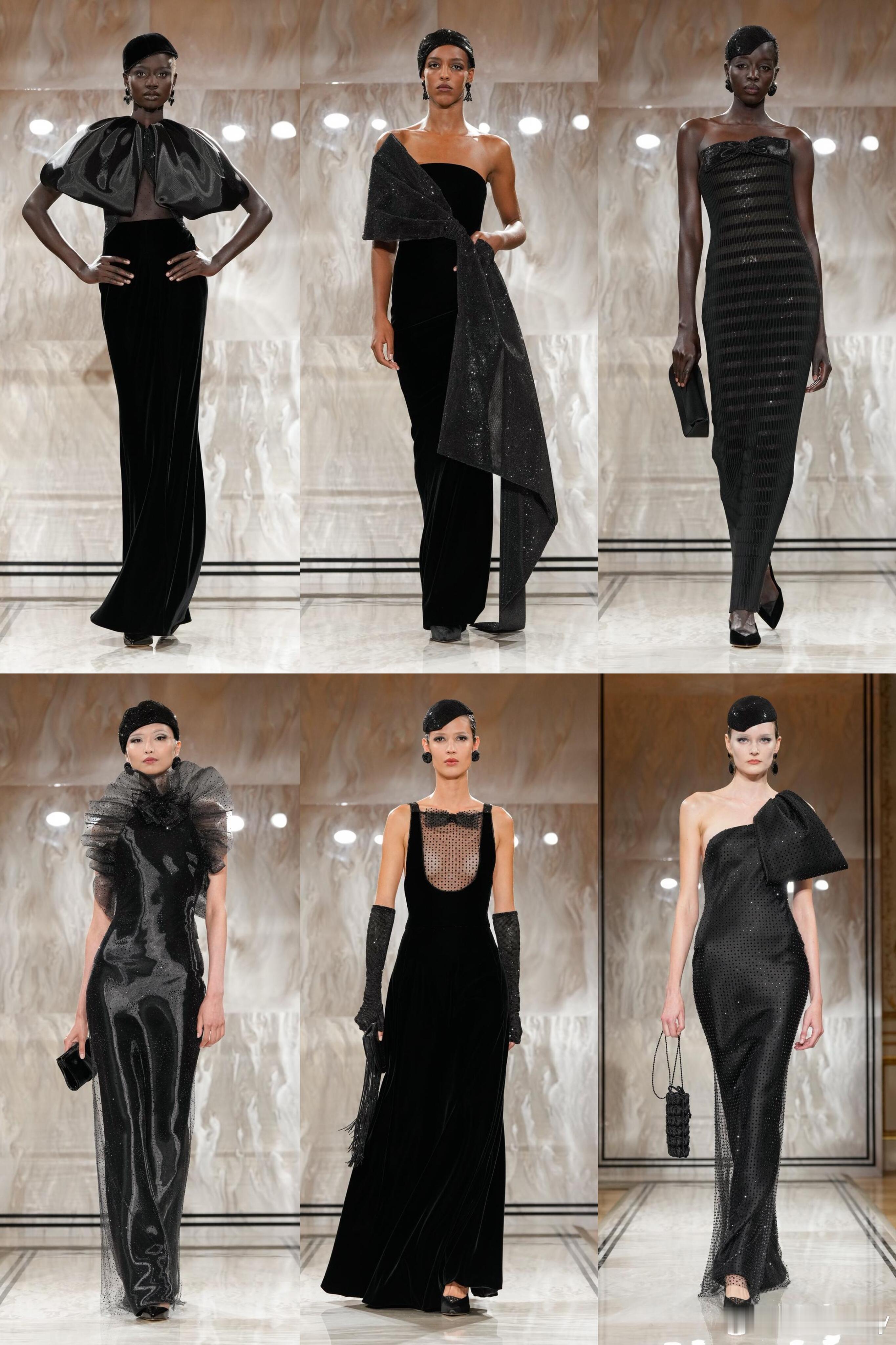 Armani Privé 2025秋冬高定秀场,乔治·阿玛尼用一场黑色盛宴颠覆想象。以“探索黑色的多元特质”为核心,吸光面料与闪耀装饰形成鲜明对话,喷气珠饰、水晶织锦与鸵鸟羽毛让暗夜迸发璀璨生机。修身晚礼服勾勒曼妙曲线,硬挺领口与夸张蝴蝶结强化戏剧张力,偶尔点缀的宝石色外套为单色系列注入灵动,将米兰风格的低调与高定的奢华完美融合。开场天鹅绒长裤的小插曲转瞬即逝,后续流畅呈现的黑色晚礼裤与各式华服,迅速将观众带入优雅节奏。更有定制香水的香气萦绕,让“性感的黑色”不止于衣袂翩跹,更成为一种渗透感官的高定态度,彰显阿玛尼半个多世纪沉淀的设计哲思与匠艺底气。时尚灵感解读大秀直击