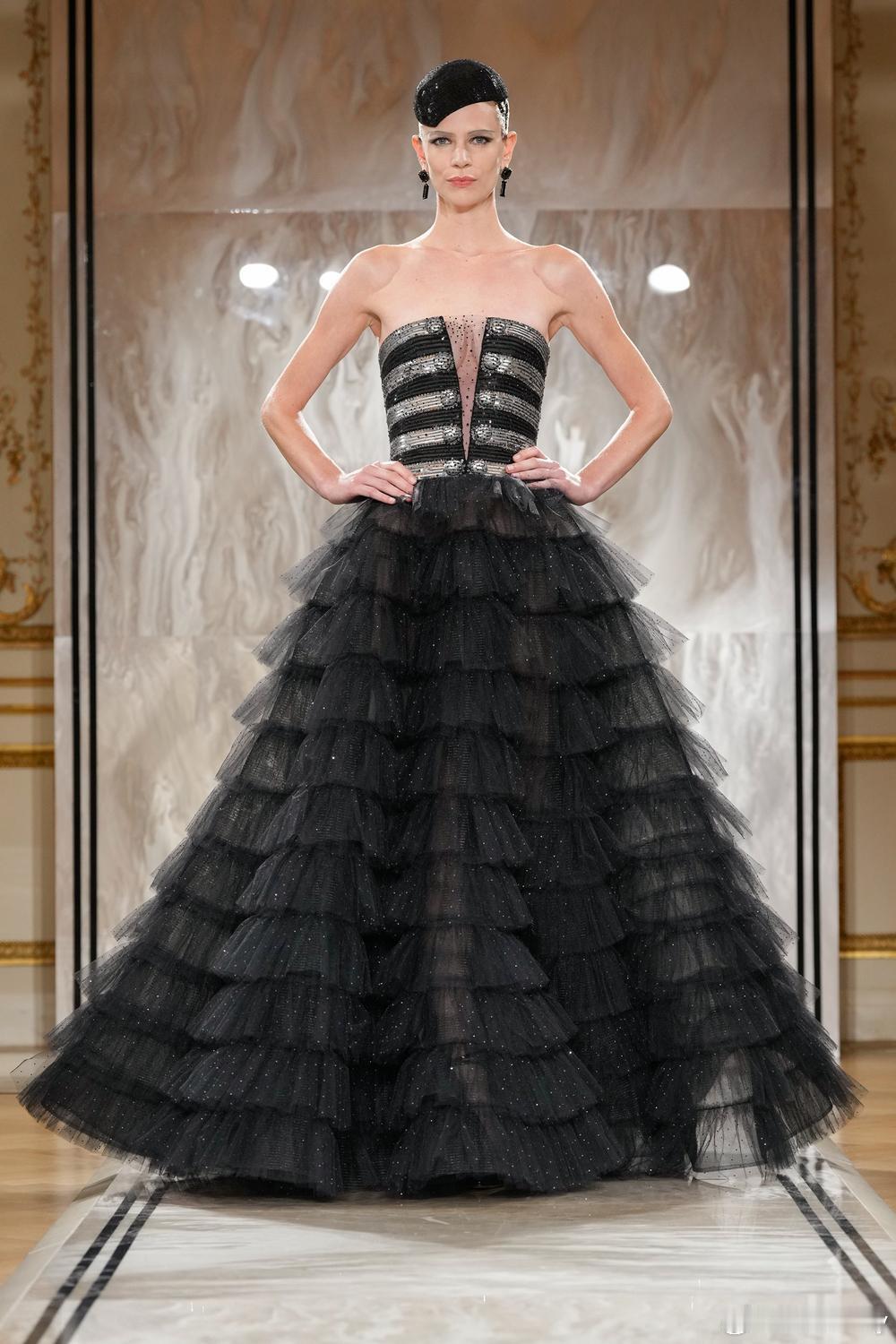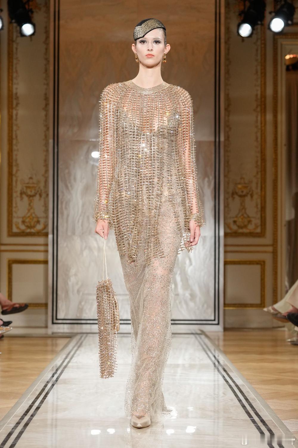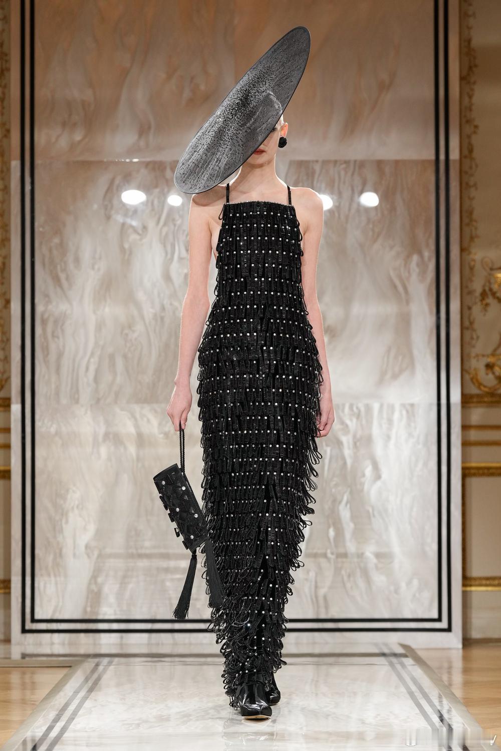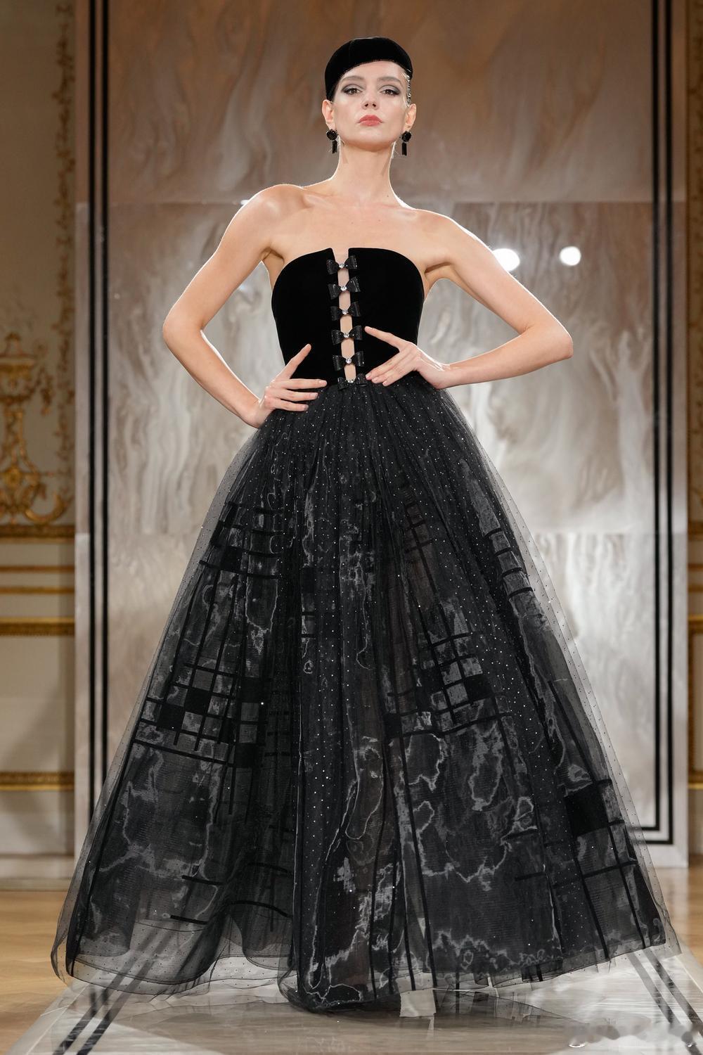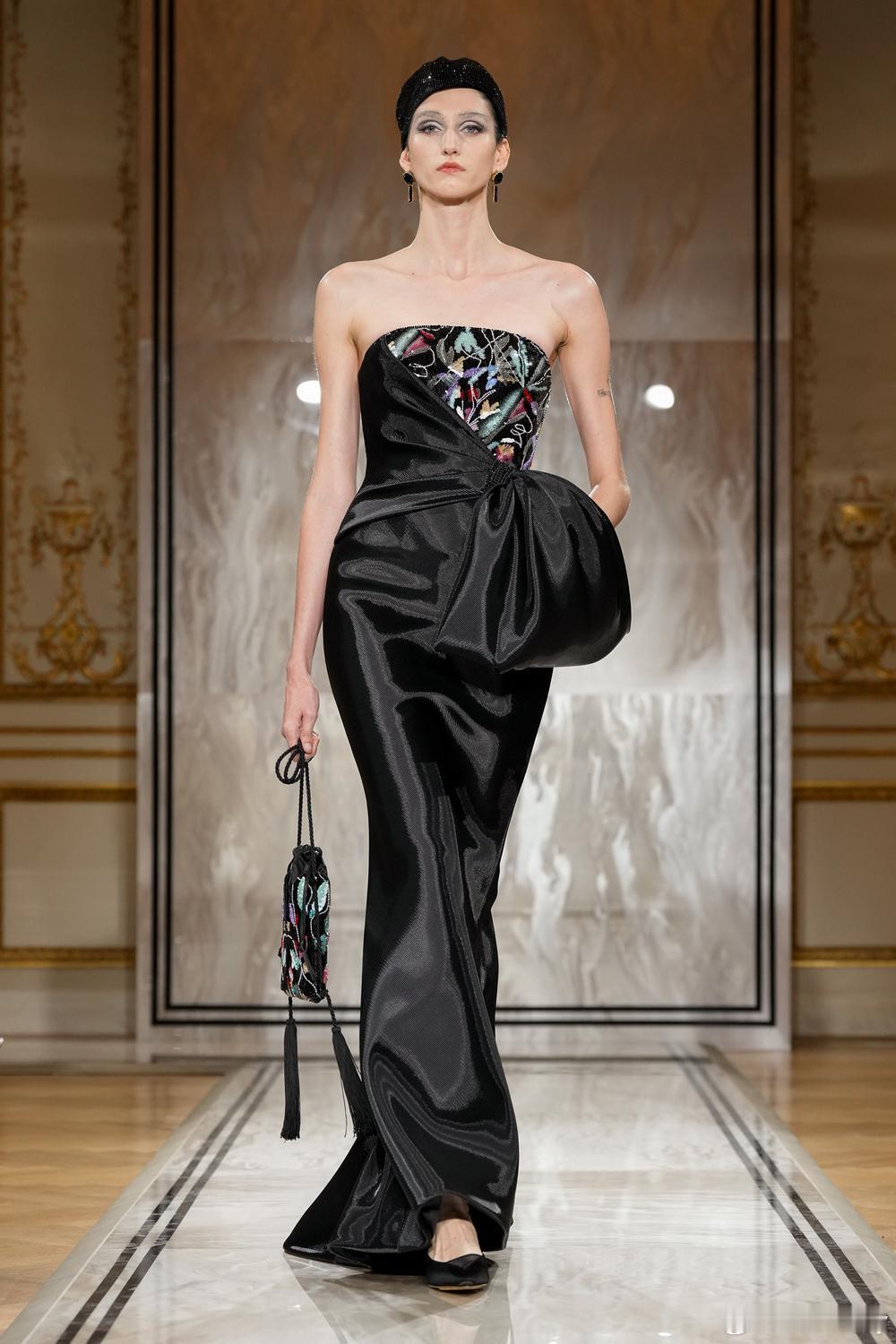 Armani Privé 2025秋冬高定秀场,乔治·阿玛尼用一场黑色盛宴颠覆想象。以“探索黑色的多元特质”为核心,吸光面料与闪耀装饰形成鲜明对话,喷气珠饰、水晶织锦与鸵鸟羽毛让暗夜迸发璀璨生机。修身晚礼服勾勒曼妙曲线,硬挺领口与夸张蝴蝶结强化戏剧张力,偶尔点缀的宝石色外套为单色系列注入灵动,将米兰风格的低调与高定的奢华完美融合。开场天鹅绒长裤的小插曲转瞬即逝,后续流畅呈现的黑色晚礼裤与各式华服,迅速将观众带入优雅节奏。更有定制香水的香气萦绕,让“性感的黑色”不止于衣袂翩跹,更成为一种渗透感官的高定态度,彰显阿玛尼半个多世纪沉淀的设计哲思与匠艺底气。时尚灵感解读大秀直击