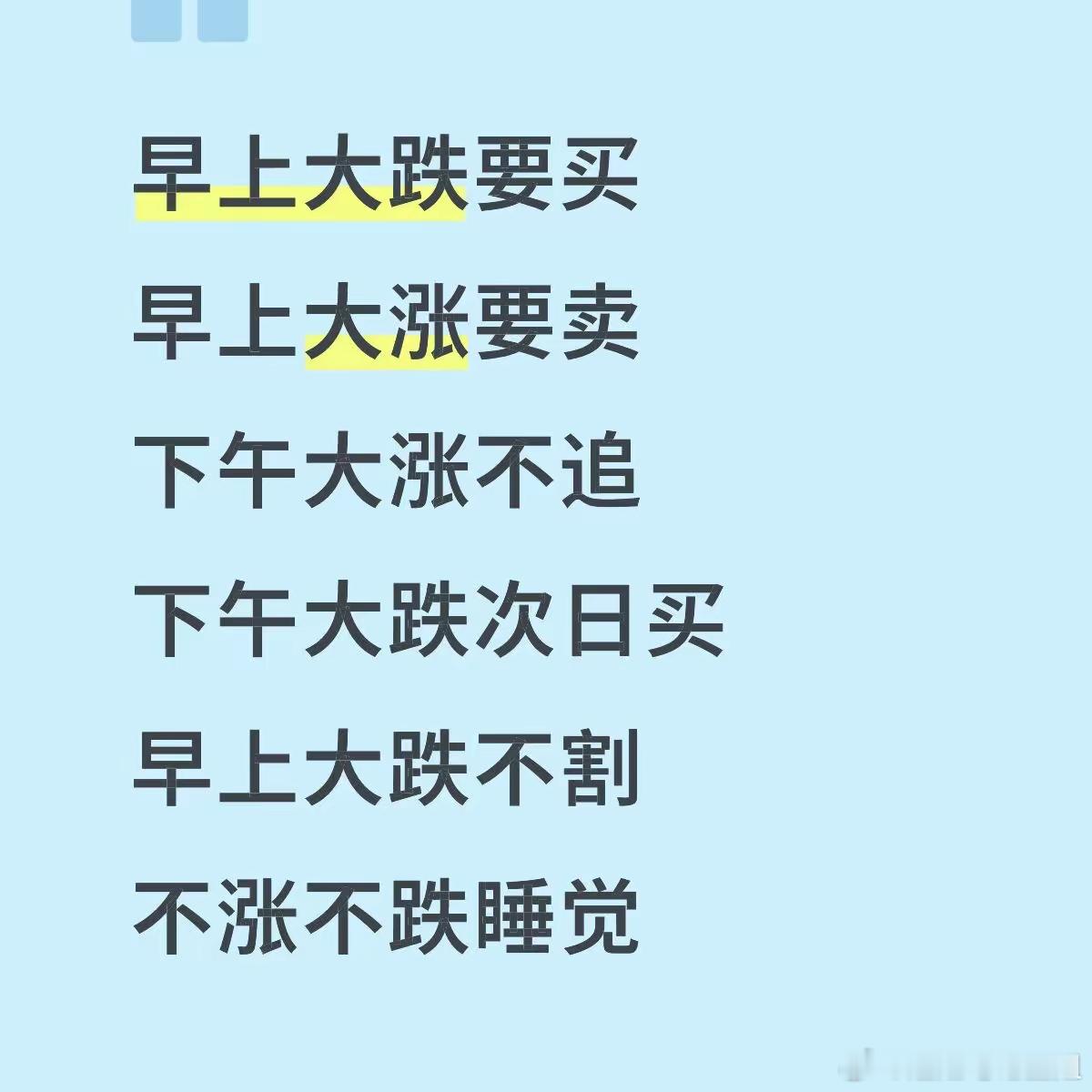 炒股入门诀,记牢少踩坑🥹早盘急跌别慌割,逢低布局好时机早盘暴涨莫贪多,落袋为安是智者午后拉升慎追高,谨防尾盘遇回调午后大跌不冲动,静待次日再行动横盘震荡无方向,耐心等待不慌张