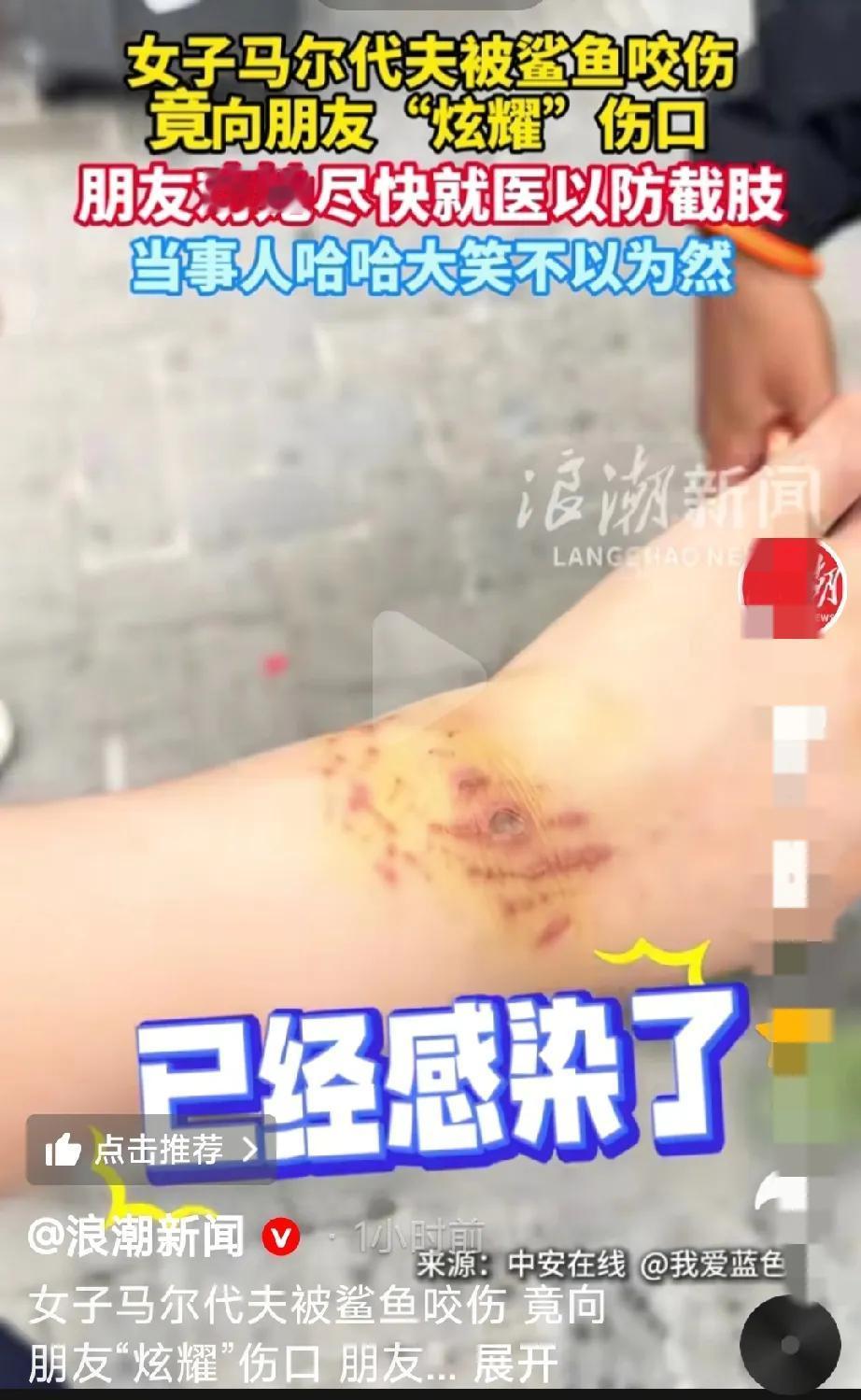 有句话说,是听人劝吃饱饭,不要把过来人说的话当做耳旁风。 也不得不佩服这女子的做法,女子生理期期间,竟然在马尔代夫潜水,不仅仅如此,在烧水过程中和和鲨鱼玩耍,不料被鲨鱼反咬一口,伤到了手腕处,这完全是侥幸啊,自己甚至还向朋友炫耀自己的伤口。 而视频中的男子声称,女子的手腕都被感染了,你要去医院,这种事情况下严重都会进行截肢的,旁边的女性朋友也是跟着附和,明天还是要这样,在去医院也不迟。 而受伤女子也是满不在乎的回应,回去就好了,即便是截肢,也仅仅是手腕处,这听到女子的口气,看得出她是不会去医院进行治疗的。 这在海中鲨鱼可不惯着你,首先说鲨鱼是冷血动物,闻到血都是兴奋,而鲨鱼的牙齿必然是带细菌的,在医院要打针进行处理,而不是简单的消消毒就能够解决,可一旦发现感染,那就不简单了。还是希望博主能够早日康复。