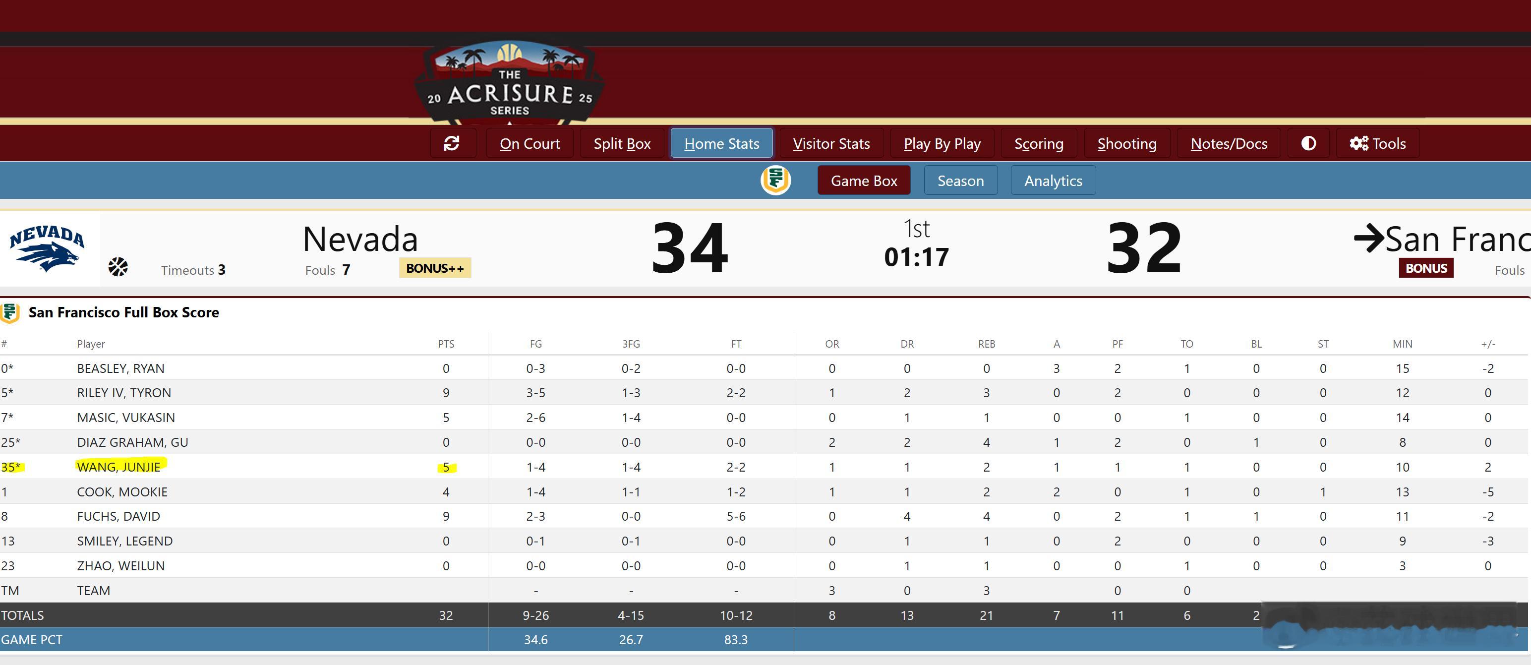 旧金山vs内华达上半场,王俊杰上场10分钟得到5分2篮板1助攻、命中一个三分球;