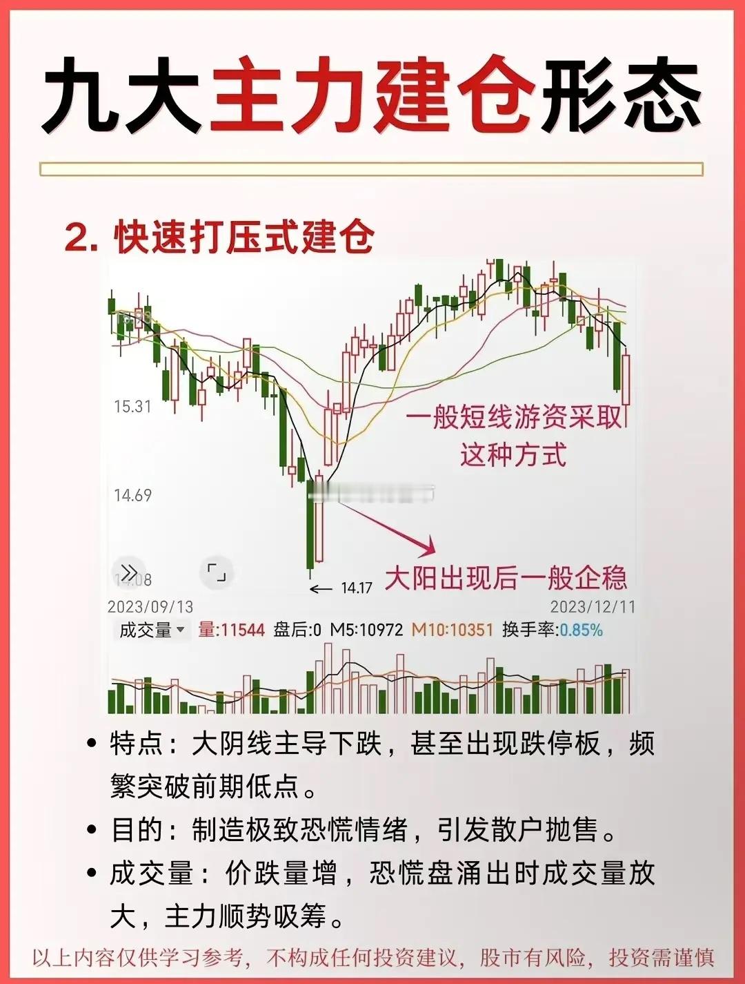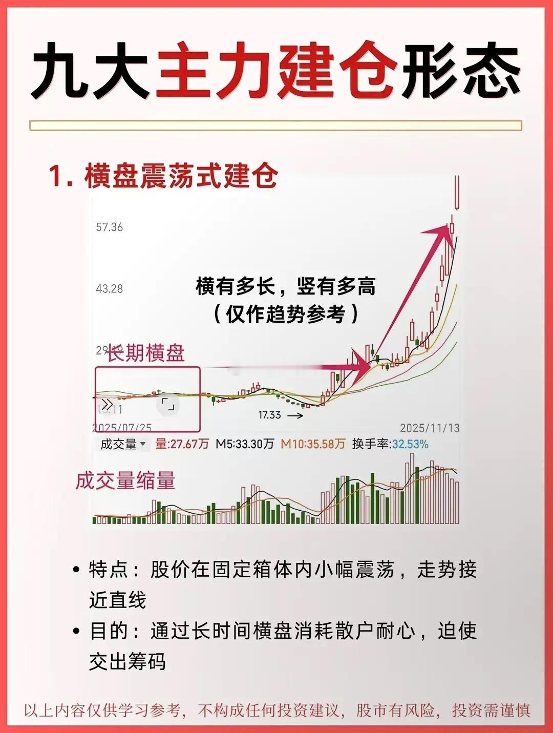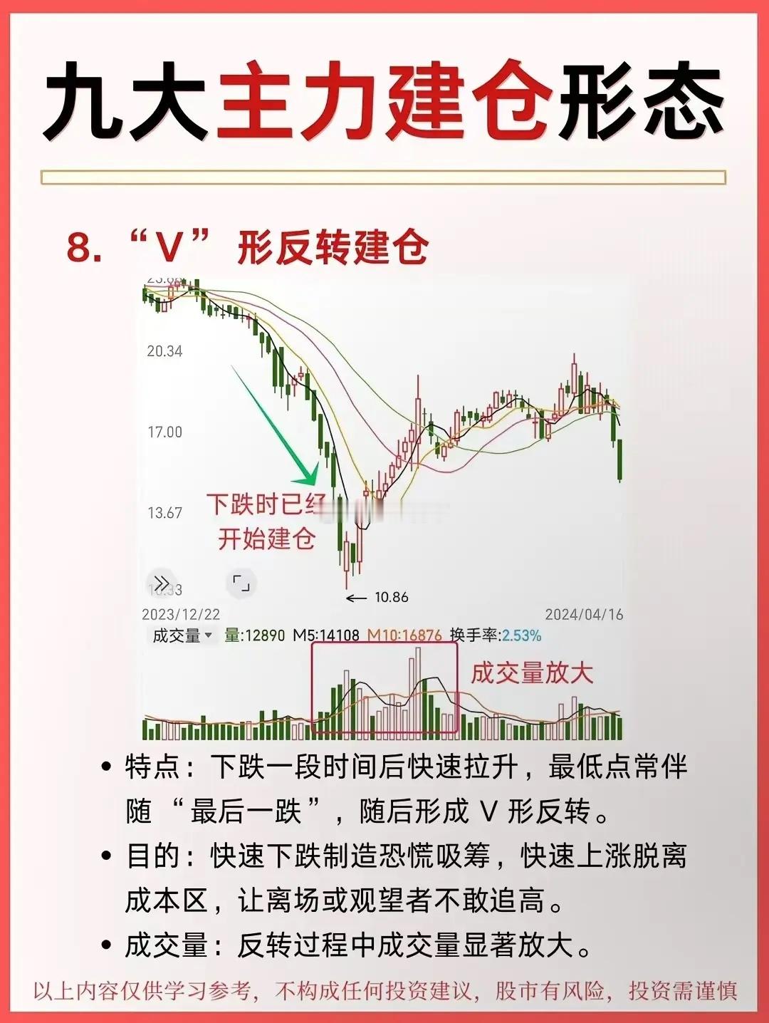 财经科普:九大主力建仓形态!单边上涨:慢涨温和放量 ;V形反转:急跌急涨放量箱体震荡箱内反复,破上沿启动快速上涨:缓慢打压:缩量阴跌破趋势线拉升快速打压:大阴砸盘,恐慌后启动长期震荡:横盘数月破平台启动。主力建仓的“闪电战”:V形反转建仓!股价先一路下探,在“最后一跌”里,主力已经悄悄开始吸筹;随后直接旱地拔葱式拉升,走出V字曲线。这波操作的核心是“快”——快速下跌砸出恐慌盘,快速上涨脱离成本区,让想抄底的散户根本追不上。行业科普仅供参考,不能作为投资依据,更不能照搬套用,理财有风险入市需谨慎!