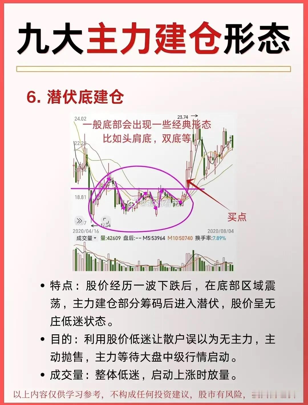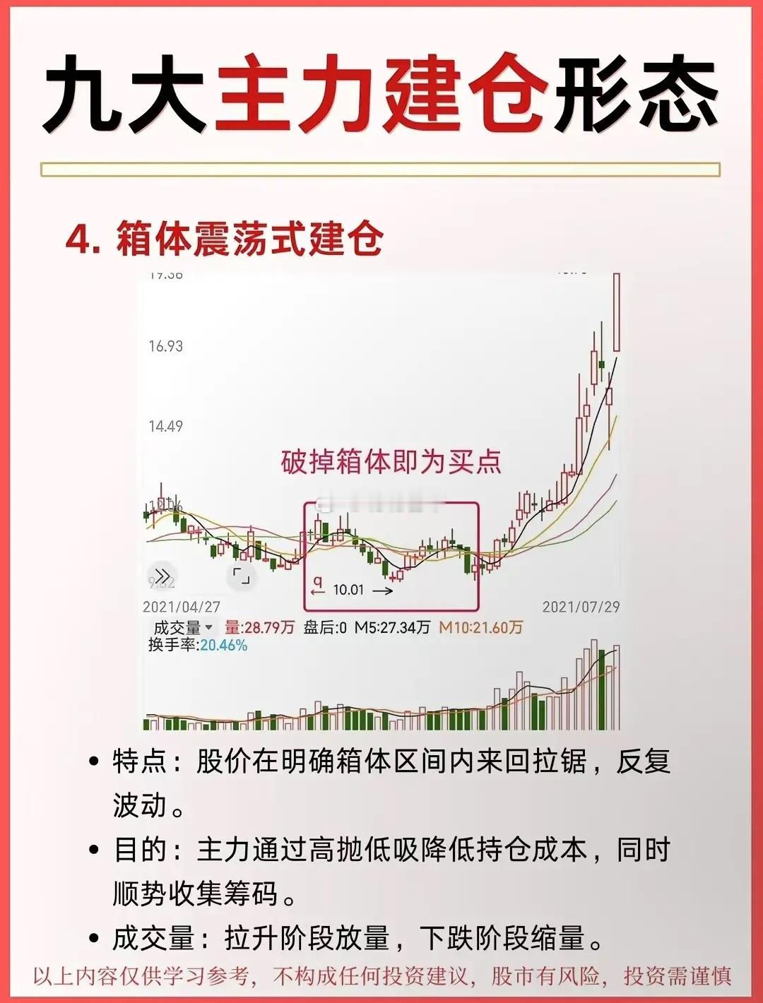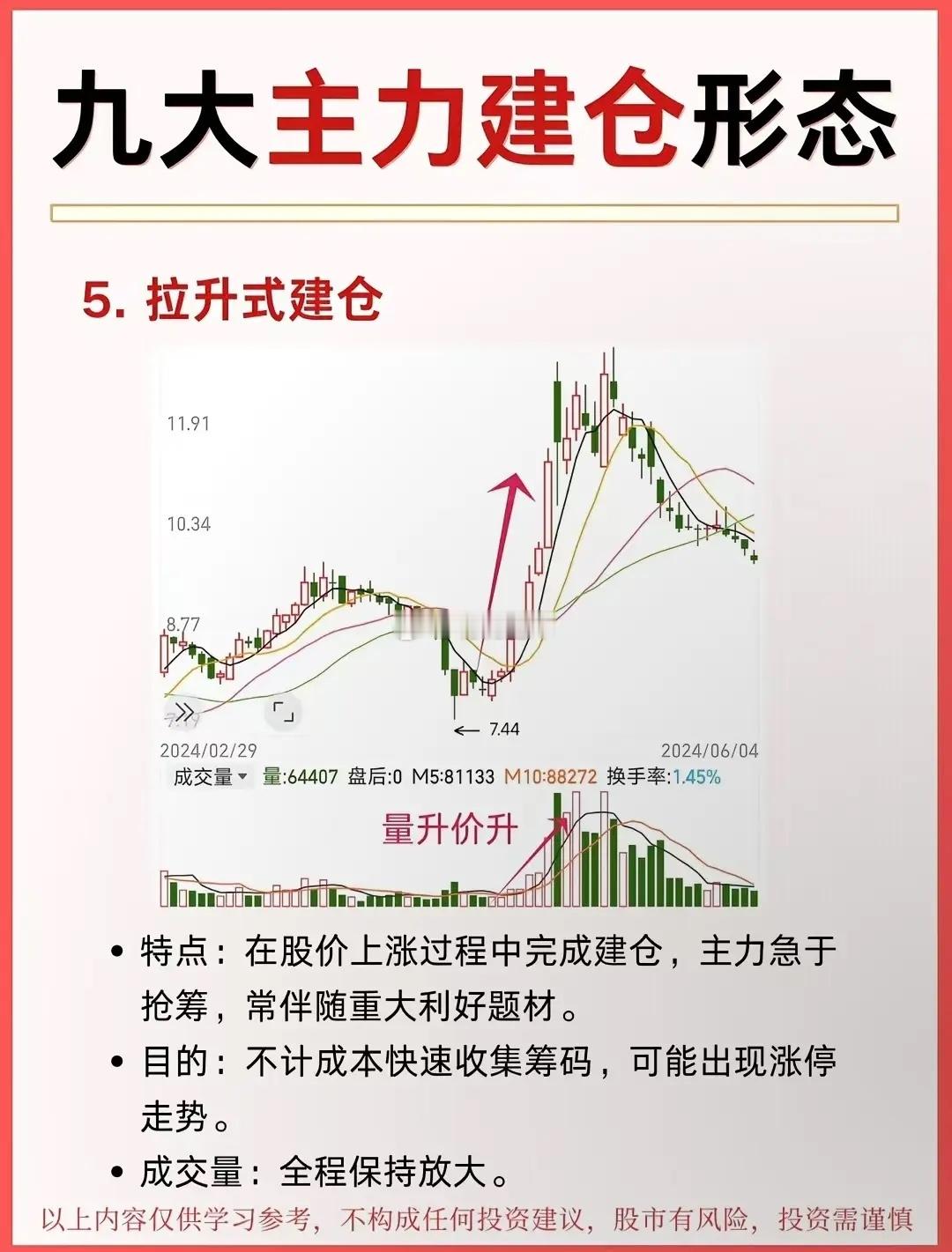 财经科普:九大主力建仓形态!单边上涨:慢涨温和放量 ;V形反转:急跌急涨放量箱体震荡箱内反复,破上沿启动快速上涨:缓慢打压:缩量阴跌破趋势线拉升快速打压:大阴砸盘,恐慌后启动长期震荡:横盘数月破平台启动。主力建仓的“闪电战”:V形反转建仓!股价先一路下探,在“最后一跌”里,主力已经悄悄开始吸筹;随后直接旱地拔葱式拉升,走出V字曲线。这波操作的核心是“快”——快速下跌砸出恐慌盘,快速上涨脱离成本区,让想抄底的散户根本追不上。行业科普仅供参考,不能作为投资依据,更不能照搬套用,理财有风险入市需谨慎!