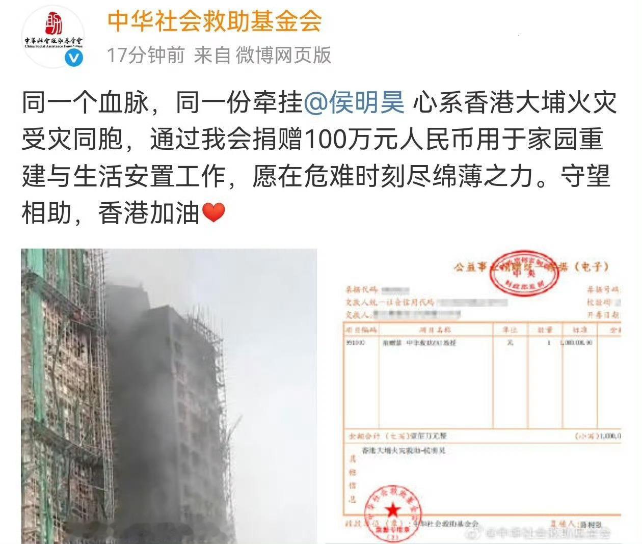 侯明昊为香港捐款100万 公益路上步履不停!侯明昊100万捐助救援,愿香港同胞都平安!一起为香港加油!!
