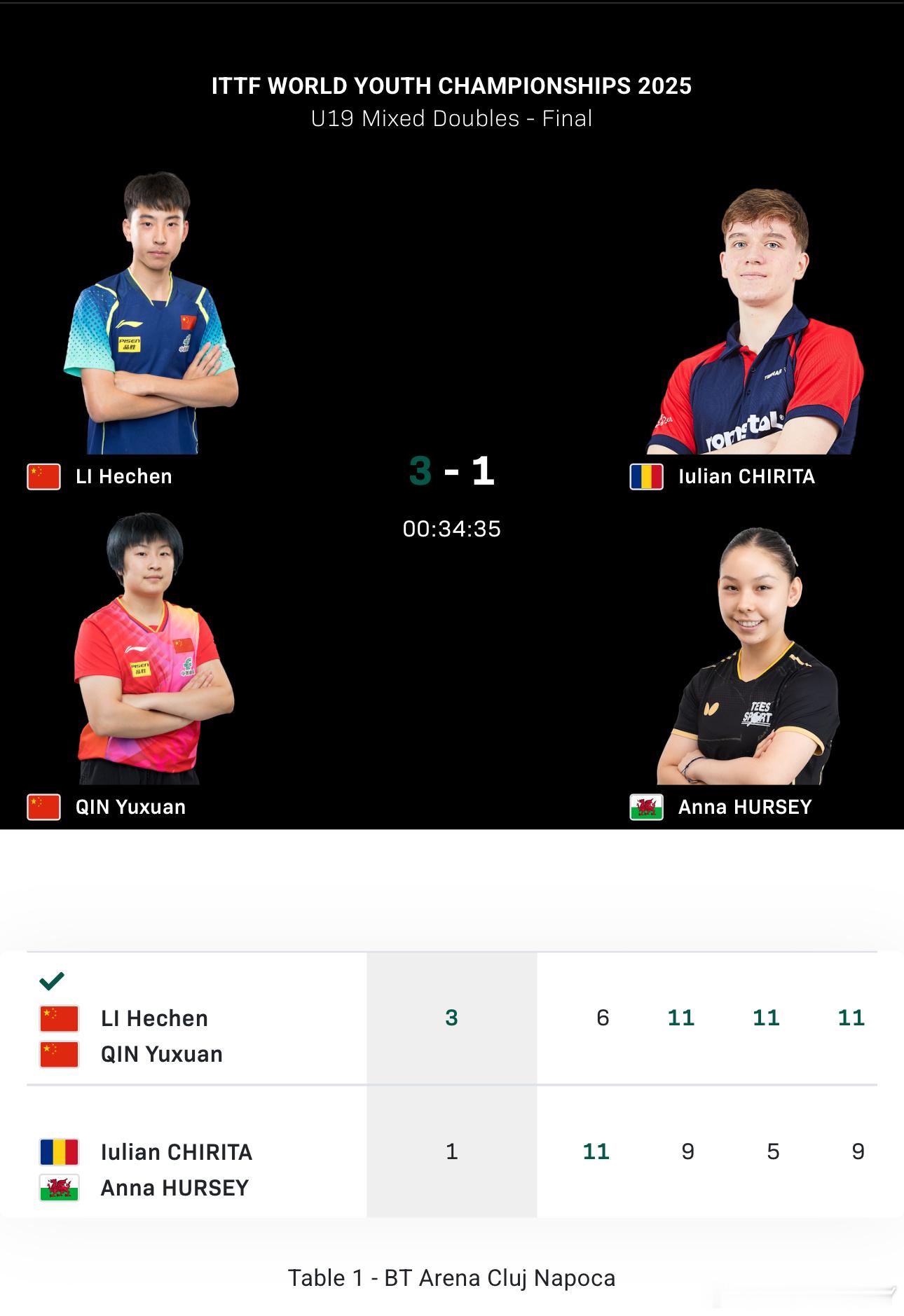 2025世青赛U19混双决赛李和宸/覃予萱3-1卢力安/赫尔希(6-11 11-9 11-5 11-9)U15结束我就睡着了不过还好教练组今晚没白忙活现在U19的7金丢了2个 得了2个U15的7金丢了3个 剩下4个也不好拿