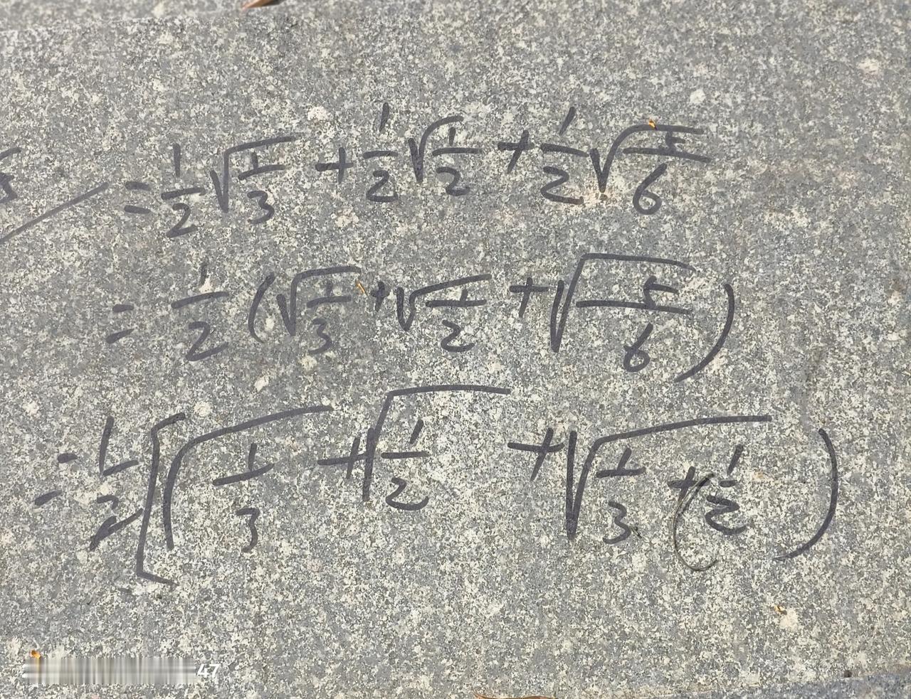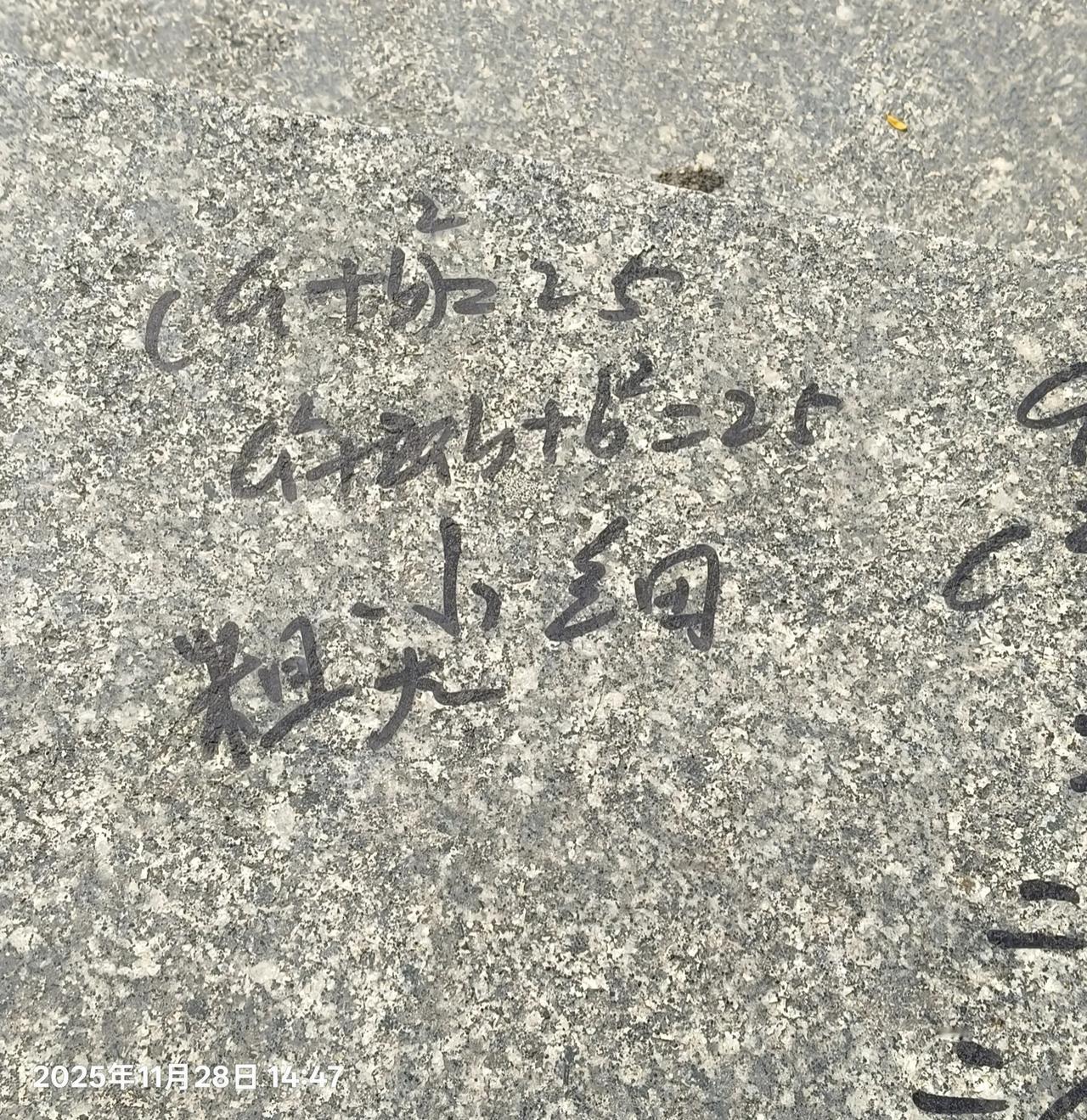 考一考头条上的朋友,有几个专业的理科生,又有几个技术人员,或者工程师级别的人。 下面这图中的几道方程式运算和几个文字表述,究竟表达的是什么东西,反正我是看不懂的。 只知道有根号,有字母,有括号,有平方,算的个什么东西呢,我就不知道了。 我惊讶是,在这么一个工业小镇,竟然还有这种人才。 这个人在这石阶上写下这么多运算步骤,是在炫耀呢,还是在废寝忘食的攻克一个什么难题呀。 但是他标注的日本、英国、美国,大、尖、小,这又表达了什么呢? 猜测了一半天,说不定这个人只不过就是一个数控机调机师傅,你说呢?