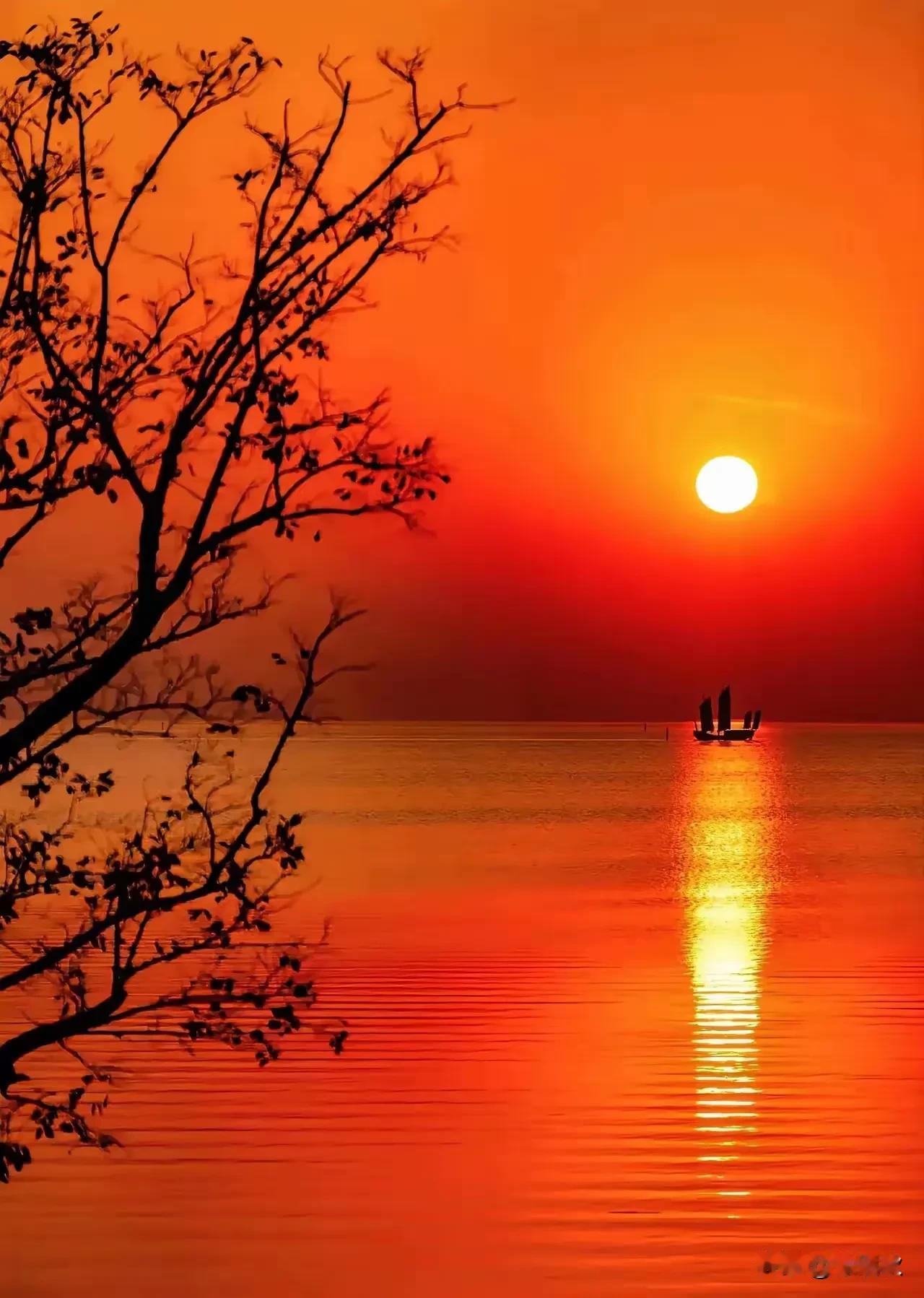竹筏轻飘夕照中 渔翁独钓一江风 青峰倒映流霞色 碧水沁染红彤彤