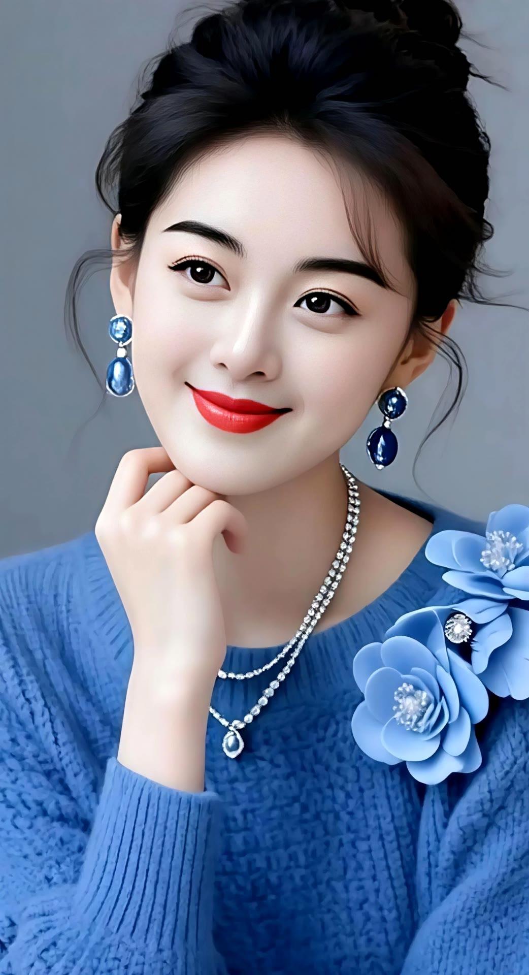 优雅蓝调,珠宝闪耀,温柔微笑,气质女神。