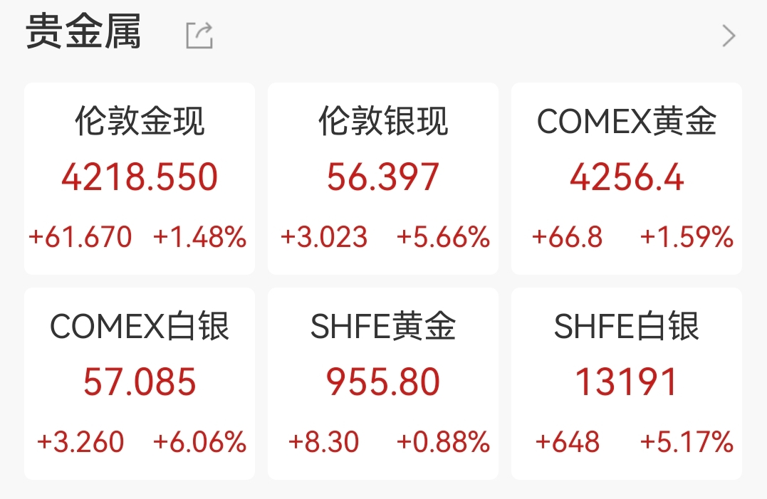 其他贵金属也明显走强。截至发稿,现货黄金价格涨1.48%报每盎司4218.55美元,为近两周以来的最高水平;现货铂金也涨近3%。