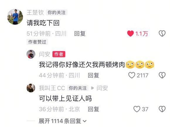 王楚钦空降评论区后,王cc也来凑热闹了, 看起来头哥不但没有让闫安请客成功, 反而让他想起了两顿烤肉, 有点亏了的感觉哦。 闫安发视频介绍北京美食,看起来很好吃的样子, 头头昨天练开心了, 开始到评论区留言,让闫安请他吃, 闫安说“我记得你好像还欠我两顿烤肉” 王cc补刀“可以带上见证人吗” 得,饭没搞定,自己要搭上两顿了😁