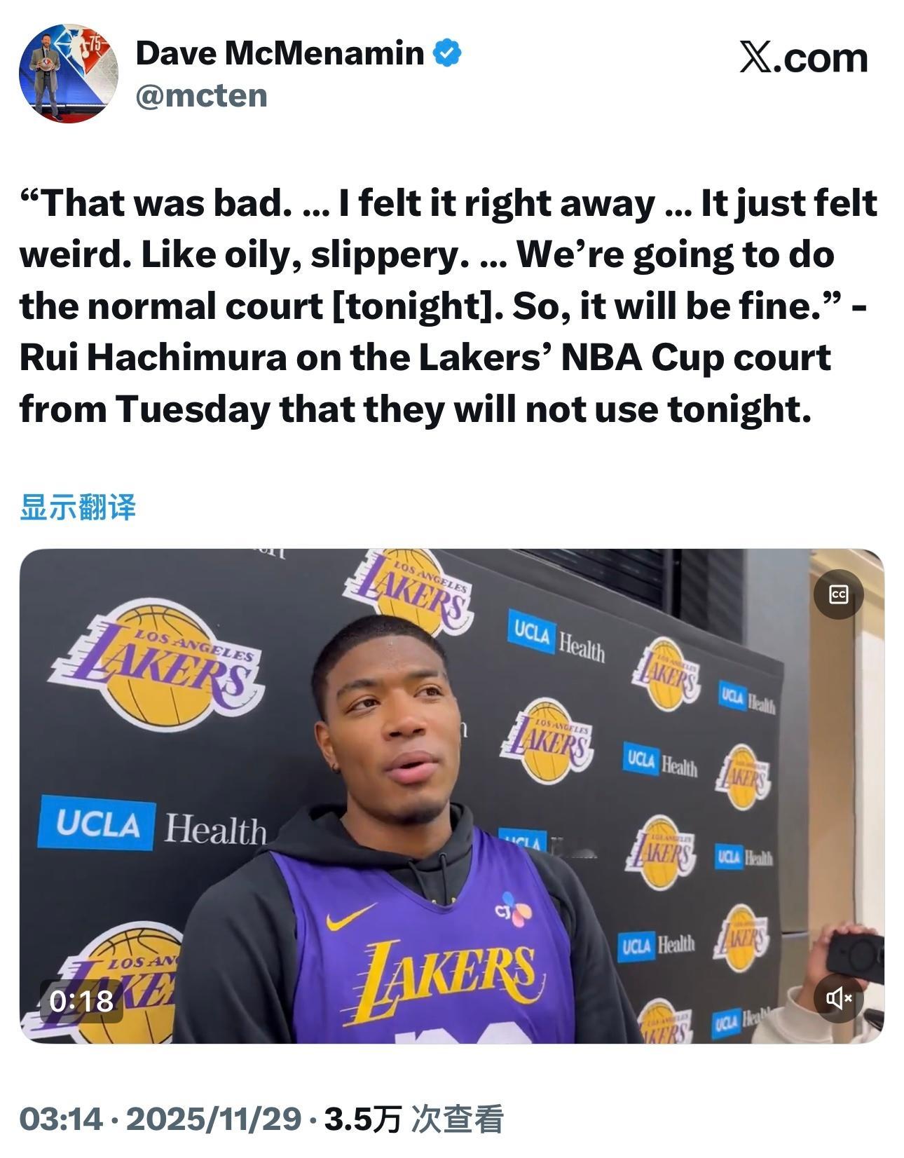 八村谈杯赛地板:“那场地太糟糕了,我当时立刻就感觉到了,就是很奇怪的感觉,像涂了油一样滑。今晚我们会用常规的球场,所以没问题的。”据湖人记者报道,杯赛地板将进行整修,估计需要两周时间。
