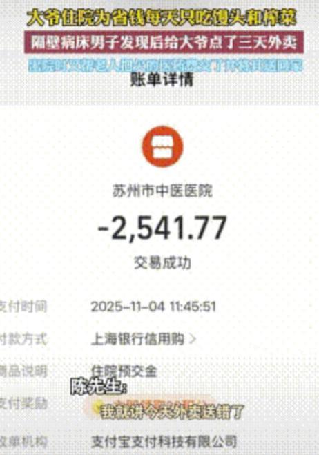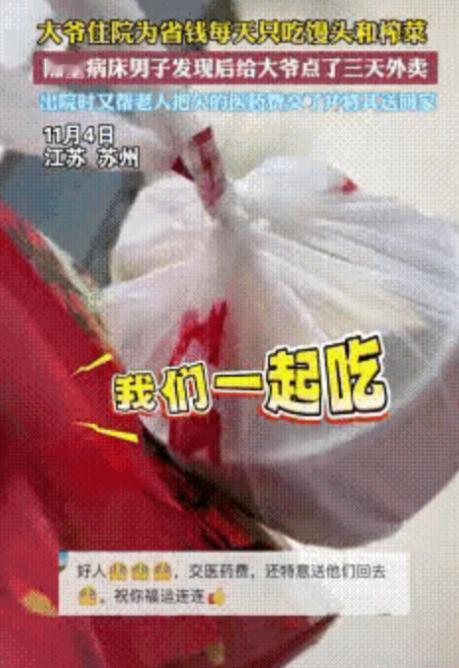 11月4日,江苏一男子生病住院,见邻床老人只吃白馒头和榨菜,男子以为老人生病只能吃这个,没想到,次日,午饭时老人又再吃!得知原因后,男子给老人点了外卖,怕老人拒绝谎称多点了一份,接下来男子的做法令网友感动不已。   35岁的陈骏(化名)因为颈椎不适住院治疗,刚住进来就发现邻床76岁的张大爷,一日三餐总离不开白馒头配榨菜,偶尔加个餐也只是一块钱的白米饭。   起初陈骏还以为是老人生病有饮食禁忌,只能吃这些清淡的,可等到第二天午饭,看到老人依旧啃着干馒头就着榨菜,他才觉得不对劲,追问之下才知道真相。   之后他给老人点了外卖,怕老人拒绝还谎称是多点了一份,而接下来他的一系列做法,让网友们纷纷直呼感动。   陈骏主动打听才知道,张大爷是因为帮人洗车时扭了腰才住院的,家里经济不宽裕,不想给在外打工的孩子们增加负担,就只能省吃俭用,把开销压到最低。   看着老人棉毛裤膝盖处缝着的三个歪扭补丁,脚上断了裂口、用线缠起来勉强能穿的拖鞋,曾经当过退伍军人的陈骏心里很不是滋味。   他知道老一辈人都好面子,硬给钱只会伤了老人的自尊,思来想去,他想到了一个既不暴露老人窘迫,又能帮到他的办法。   当天午饭,陈骏就“多订”了一份清蒸鸡饭,送到病房后,装作不经意地对张大爷说:“大爷,我点多了一份,退也退不掉,扔了多可惜,您帮我分担点呗。”   张大爷起初还推辞,架不住陈骏热情劝说,最终还是收下了。   从那以后,陈骏就经常上演“外卖点多了”“商家送错了”的戏码,每次都带着不同的饭菜来“分享”给张大爷。   为了让这份善意不显得突兀,陈骏还特意做了功课。他偷偷跑去问医生老人的饮食禁忌,专门挑清蒸鸡、冬瓜丸子汤、软烂的排骨这些清淡又营养的菜色,避开了油腻和高糖的食物。   有时候饭菜里有辣椒,他都会提前一颗颗挑出来,细心照顾着老人的口味。   原本沉默寡言、总盯着天花板发呆的张大爷,在热气腾腾的饭菜滋养下,脸上渐渐有了笑容,也开始和陈骏絮叨起自己年轻时的往事,病房里的气氛渐渐热闹起来。   一周后到了出院结算的日子,张大爷颤巍巍地从洗得发白的蓝布包里掏出一沓卷边的零钱,有一元的硬币,也有皱巴巴的小额纸币。   老人用沾着唾沫的手指反复数了三遍,可这一千多块的家底,距离5200元的医药费还差着一大截。   看着老人红着眼眶,准备掏出手机给儿子打电话借钱时,一直默默看在眼里的陈骏,悄悄走到结算窗口,把老人医药费的2500多块差额,连同自己的账单一起结了。   结完账后,陈骏像往常一样,若无其事地帮老人拎起行李,送他下楼,全程没提一个“钱”字。   直到快走出医院大门,追上来的护士不小心说漏了嘴,张大爷才知道这位萍水相逢的“邻居”不仅天天“分享”饭菜给自己,还悄悄替自己垫付了医药费。   那一刻,老人手里的蓝布包差点没拿稳,他回头望着住院部大楼,眼泪瞬间就涌了出来,嘴里反复念叨着“这可怎么好,这可怎么好”。   陈骏没让老人的感动停在原地,他担心刚伤愈的老人挤公交折腾,特意把自己的车开到医院门口,将张大爷和赶来接他的老伴一路送回了家。   老两口实在无以为报,硬是从院子里扒出半袋自家种的红薯塞进陈骏怀里,这是他们能拿出的最珍贵的谢礼,陈骏推辞不过,笑着收下了这份沉甸甸的心意。   这段温暖的经历被传到网上后,不少网友想给陈骏转账,还有人想直接资助张大爷,但都被陈骏婉言回绝了。他把之前网友送来的一点心意取成现金送给了大爷,之后就暂停了视频更新。   在他看来,这只是一场不必声张的遇见:看出了对方的窘迫,却不愿拆穿;想伸手帮一把,更想护住对方的体面。那些被说成“点多了”“送错了”的盒饭,就像初冬里的一缕暖阳,温暖得恰到好处。   生活里的善意,往往不在于多么惊天动地,而在于这种小心翼翼的呵护与体谅。陈骏用最笨拙却最真诚的方式,守住了老人的自尊,也传递了人与人之间最珍贵的温情。
