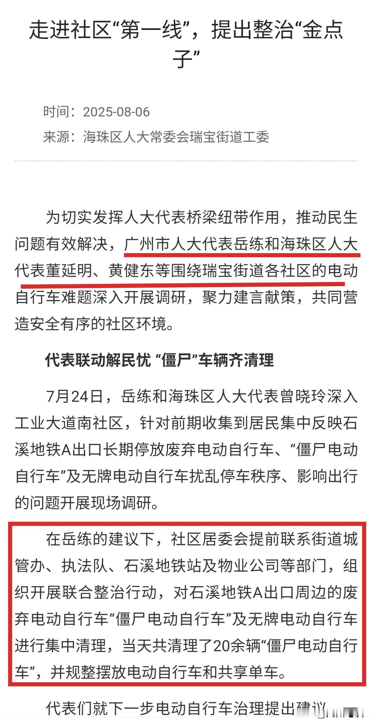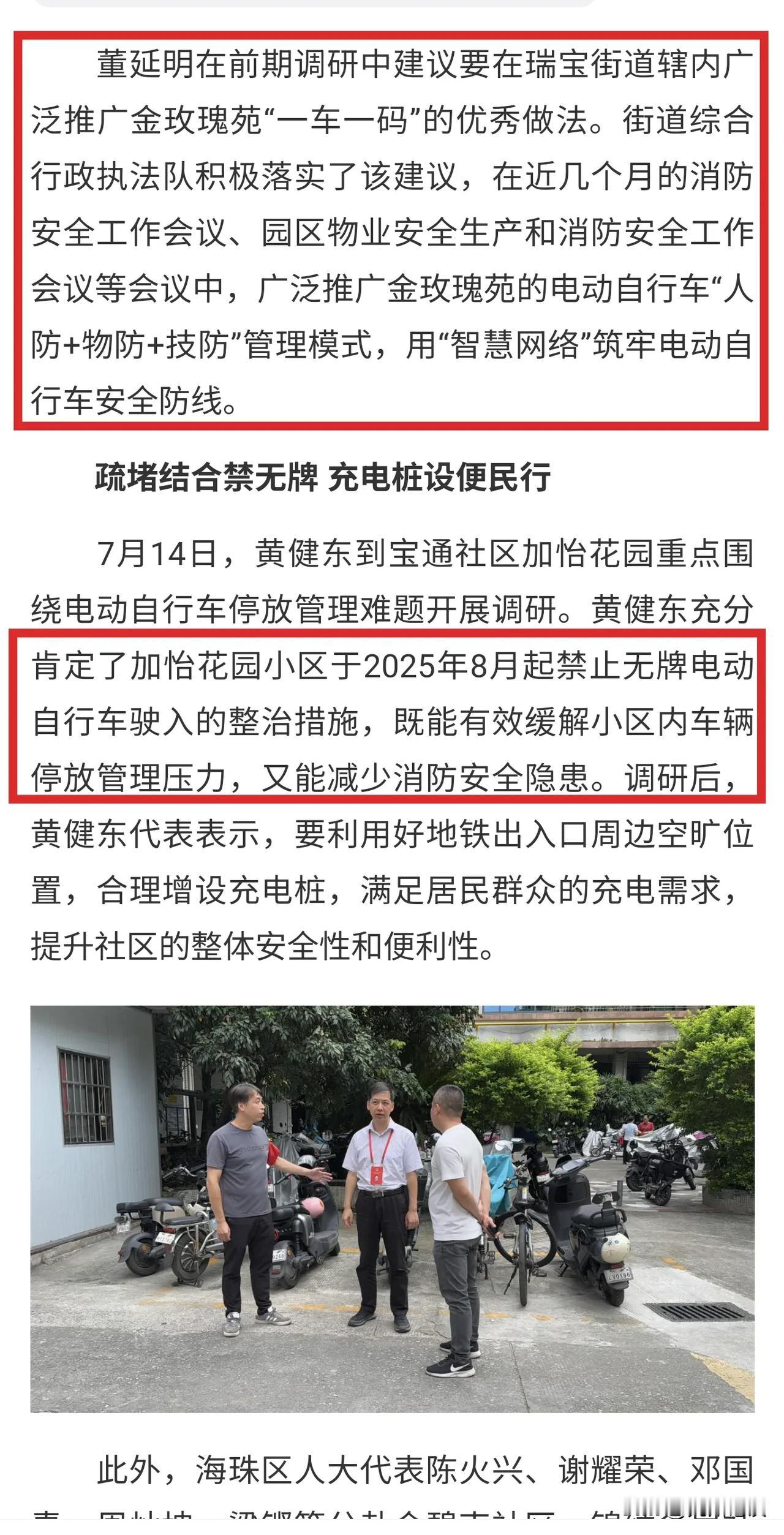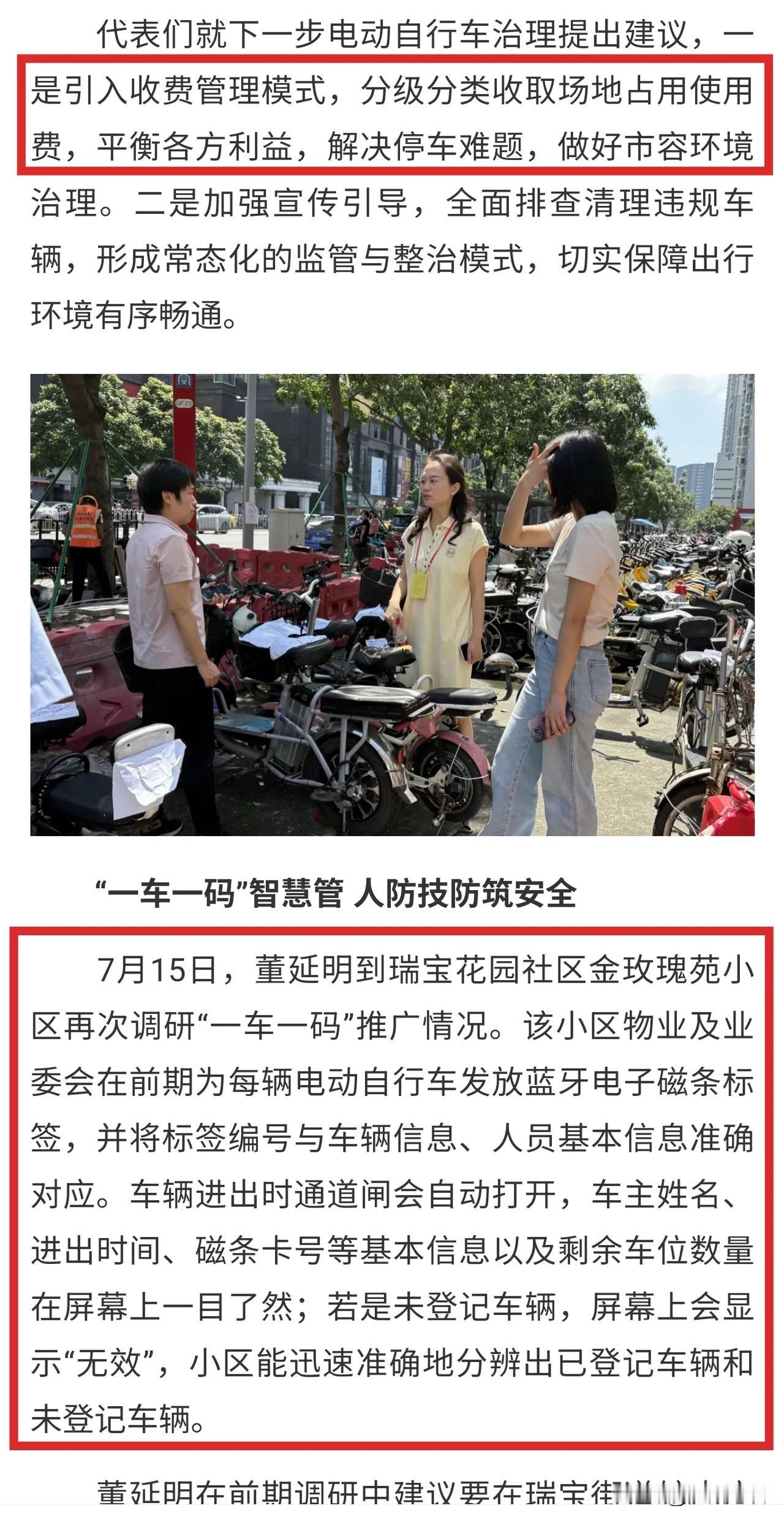 “上兵伐谋”,代表们在忙本职工作之余,顶着酷暑履行代表职责深入社区调研,提出“金点子”治理电动自行车,服务不停歇! “一车一码”,“人防+物防+技防”,广州推进电动自行车治理进小区!让无牌使用电动自行车无处可逃! 充分发挥小区物业的管理职能,对本小区合规电动自行车发放一车一码,人车合一。 利用蓝牙、5G等技术服务管理,构建覆盖本小区的天罗地网,管理好自己的一亩三分地。 既能减少管理压力,又能减少安全隐患。 开电动自行车,上牌是天经地义的事。 一切的不上牌说破天都不是理由! 超标车就处理掉,改换符合国标要求的车辆。 先小区小范围试点,再街道大范围试点,成熟了就可以全区大范围推广,进而全市大范围推广,最终实现全市无无牌电动自行车。