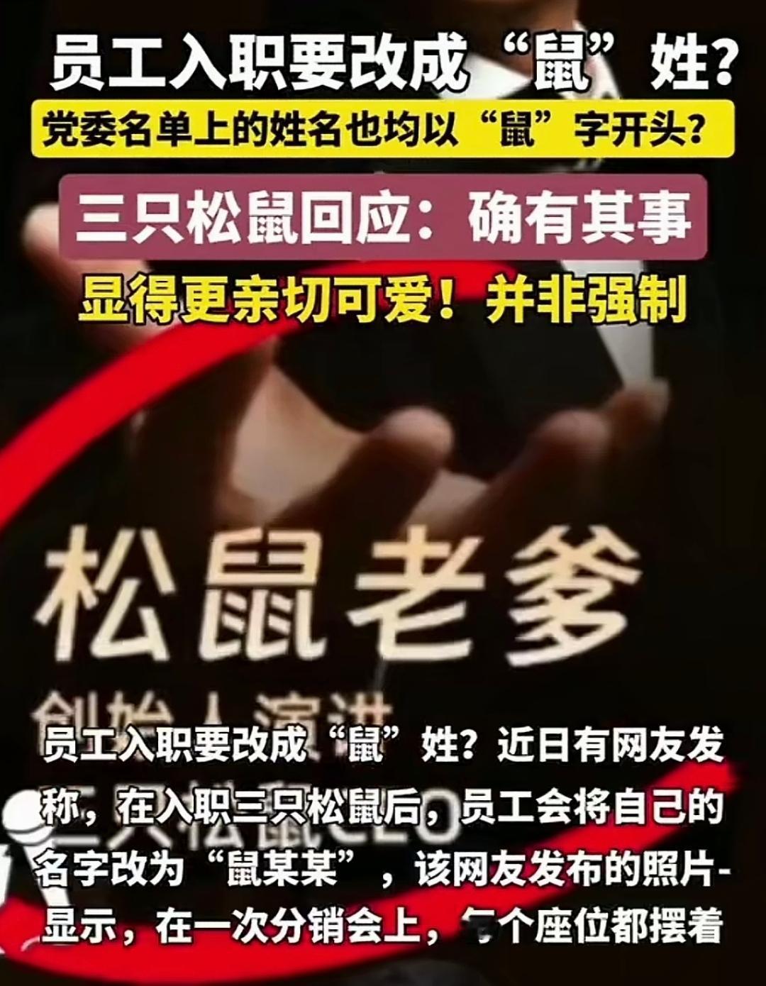 三只松鼠让入职员工改“鼠姓”,这究竟是可爱还是荒唐? 近日,有网友发文称:“三只松鼠要求员工改鼠姓”的消息突然引起热议。 据网友流出的图片显示,上面清一色标注着“鼠小明”“鼠小仁”等名字。甚至连党委名单上的名字,也都是以鼠字开头。 三只松鼠官方对此坦然承认:确实鼓励员工使用“鼠”字开头的花名,称这样“更亲切可爱,也更符合品牌调性”,但同时强调绝非强迫。 这究竟是文化创新还是职场压力? 尽管公司声称“自愿”,可加入了该企业,顶头上司和周围同事都成了“鼠某某”,你不改会不会被当成“异类”?难道不会有压力吗? 有网友调侃:“党委名单都改成了鼠姓,这党性里会不会掺了零食的味道?” 对于一家企业而言,想用轻松的氛围拉近距离这无可厚非。但当文化开始“入侵”姓氏,是否该思考,企业文化该不该有边界? 如果换作是你,是会笑着接受,还是会反问一句:“凭什么呢?”