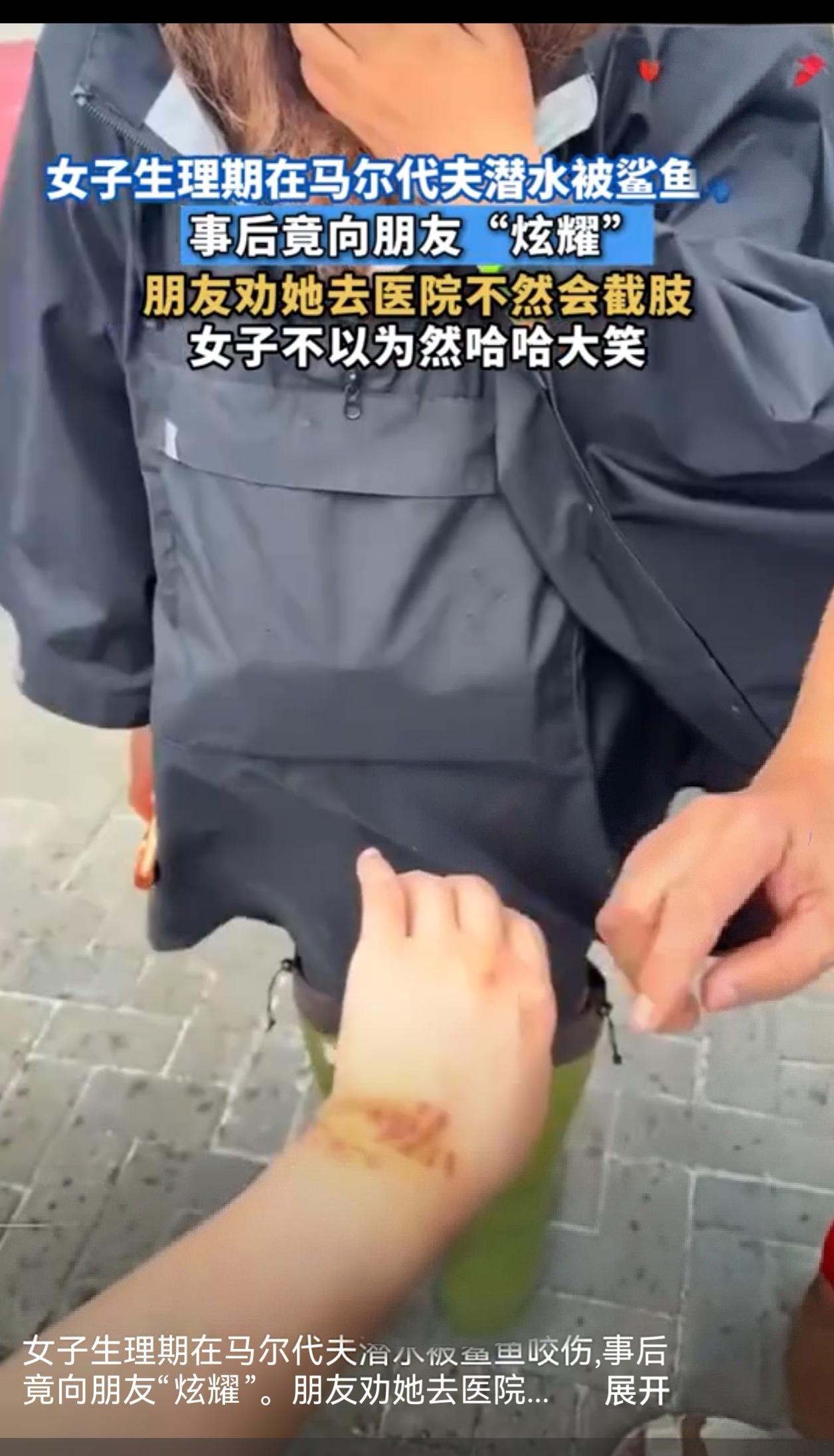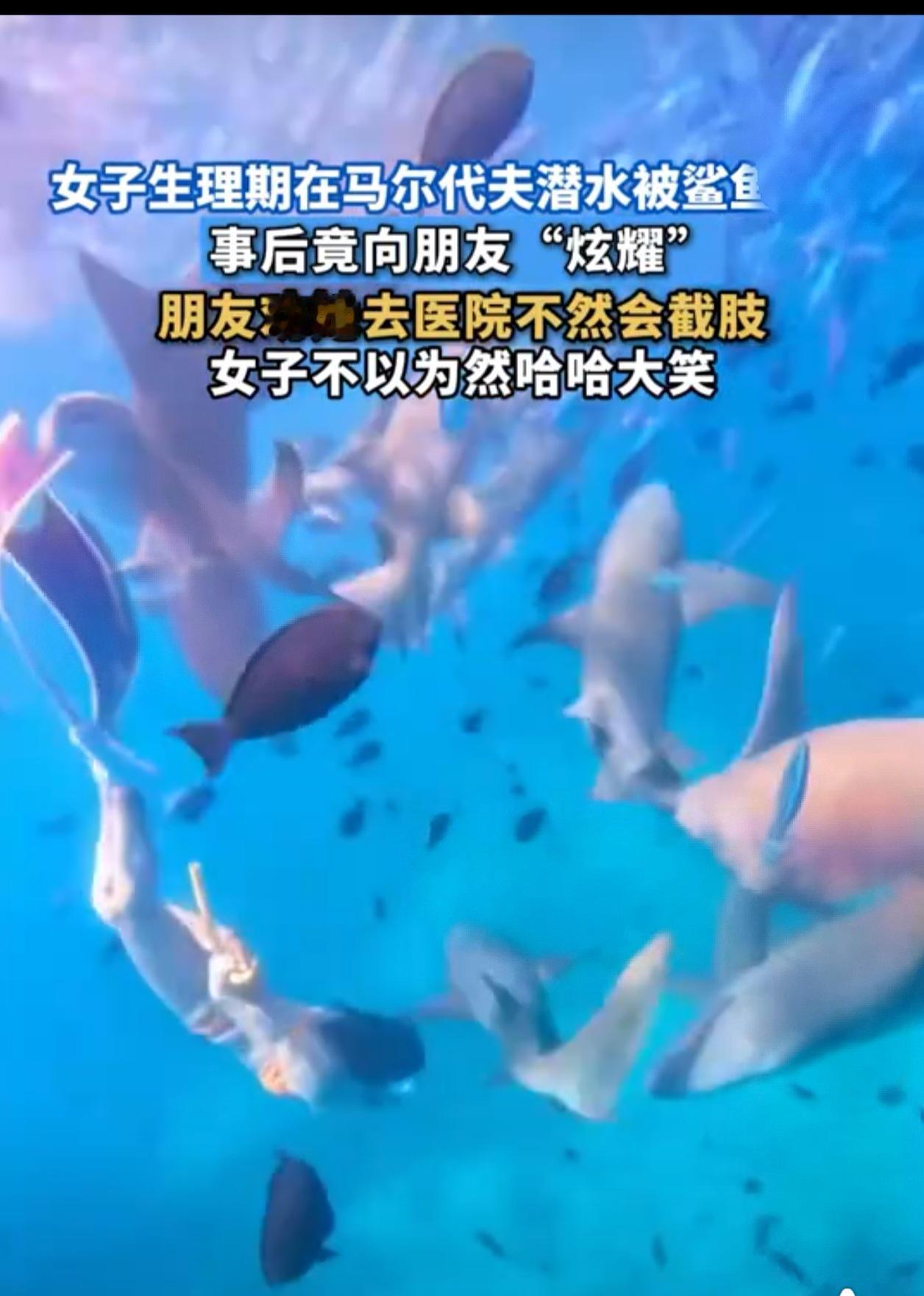 人怎么可以显摆到这种程度。一位女子生理期在马尔代夫潜水被鲨鱼咬伤,事后竟向朋友“炫耀”。朋友劝她去医院不然会截肢,她却哈哈大笑。这人是愚蠢呢还是疯了呢?