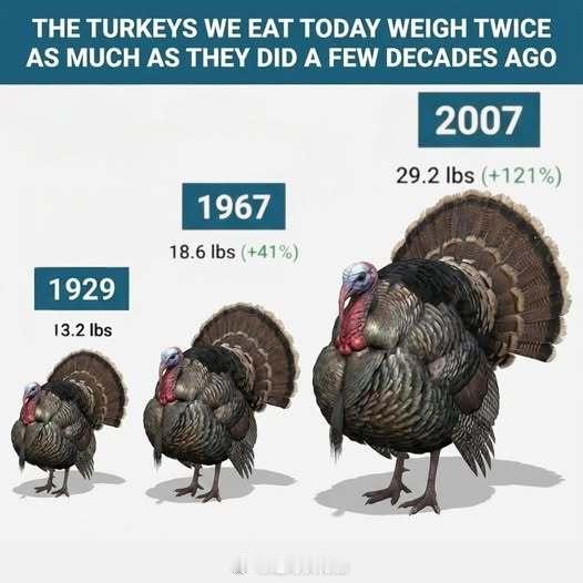 今天的火鸡体型已经是1930年代的两倍多了。人类在家禽、家畜的养殖方面不断改良,有好有不好吧。火鸡 家禽 动物科普 广州
