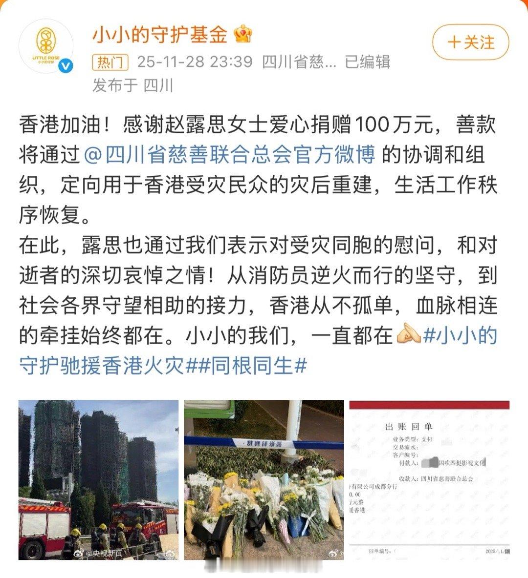赵露思爱心捐赠100万元,善款将通过四川省慈善联合总会官方微博的协调和组织,定向用于香港受灾民众的灾后重建,生活工作秩序恢复