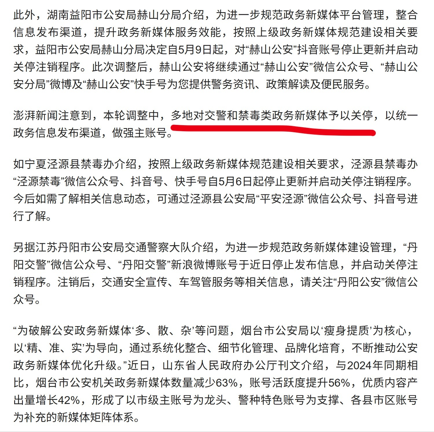 很多人提到北京禁毒、云南禁毒等等禁毒账号搜不到了,怀疑是这次事件引发的其实这是2023年国办下发了《关于防治“指尖上的形式主义”的若干意见》以后,各地对政务账号进行了清理,对一些没办法运维、运维不够好的账号予以关停,或者同一个级别只保留一个账号,所以一些交警类、禁毒类的账号就关停了,集中使用当地公安账号予以发布,比如云南就是云南警方,北京就是平安北京澎湃新闻也专门进行了报道,其中就提到了一些地方主要关停了交警和禁毒类账号,统一信息发布渠道既然舆论有质疑,平台方如果能公布一下注销时间,就更好……豆花的碎碎念热点观点