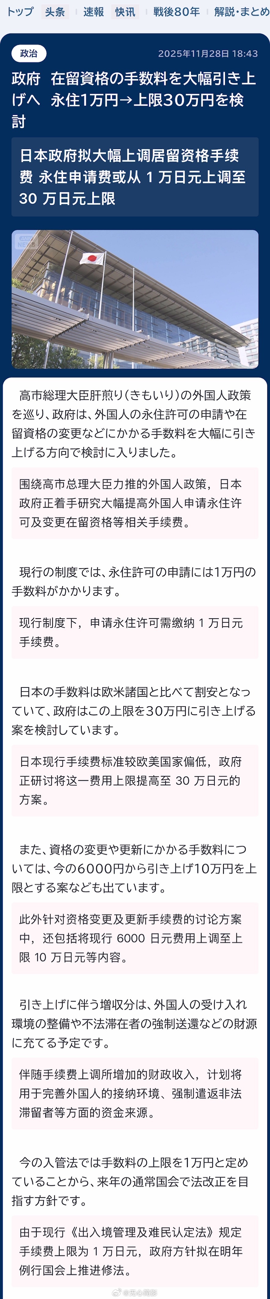 日本明年要提高居留资格手续费,永居手续费最高提高到 30 万日元……海外新鲜事