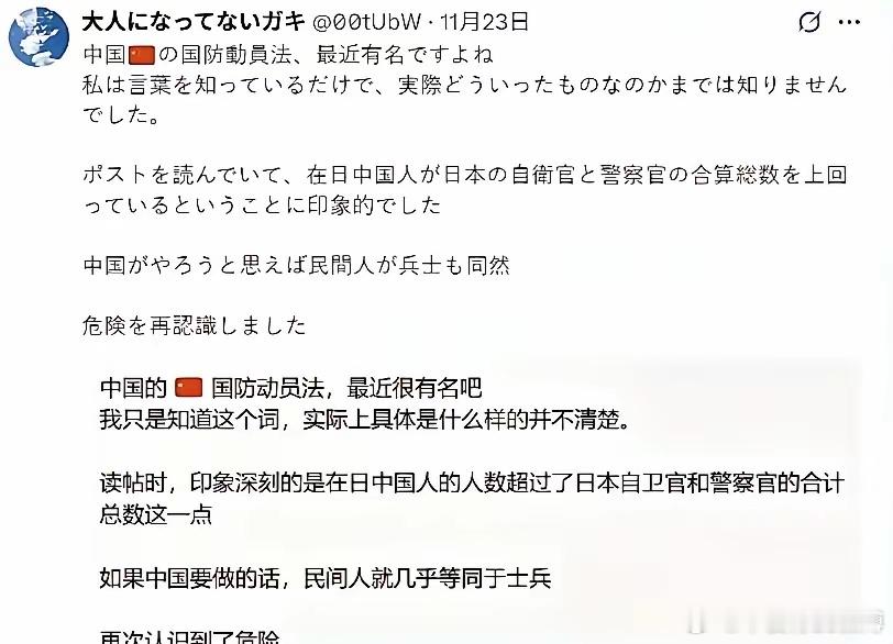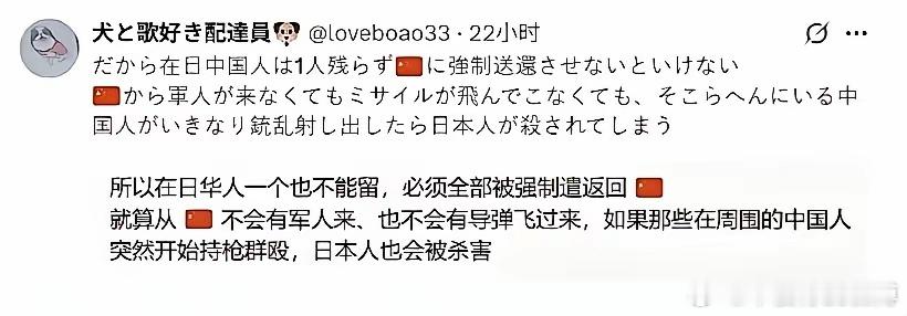 在日华人危险了?日本右翼网红:在日中国人都是“便衣兵”,随时用AK扫射日本人近日,日本极端右翼网红桥本琴绘发帖宣称,一旦中日两国开战,那么在日本的中国人就会端起AK-47扫射日本人。桥本琴绘称,2011年时,有60万中国人居住在日本,而当时的日本自卫队和警察部队,加起来也不过62万左右。而因为中国的《国防动员法》,这些在日中国人有屠杀日本人的“法律义务”,所以他们都是“便衣兵”。