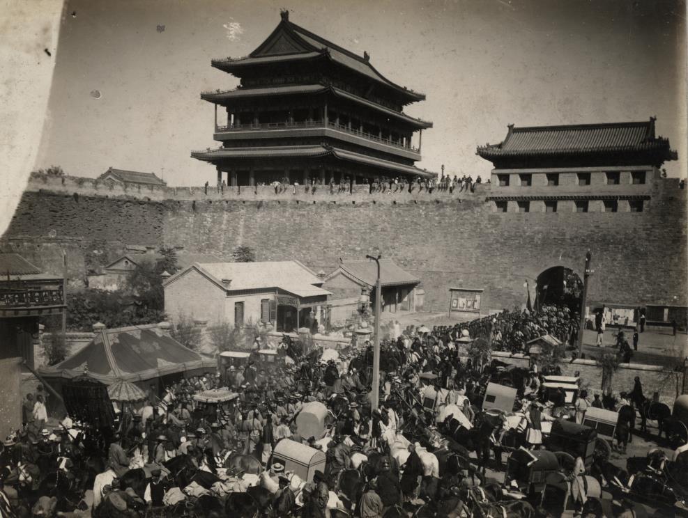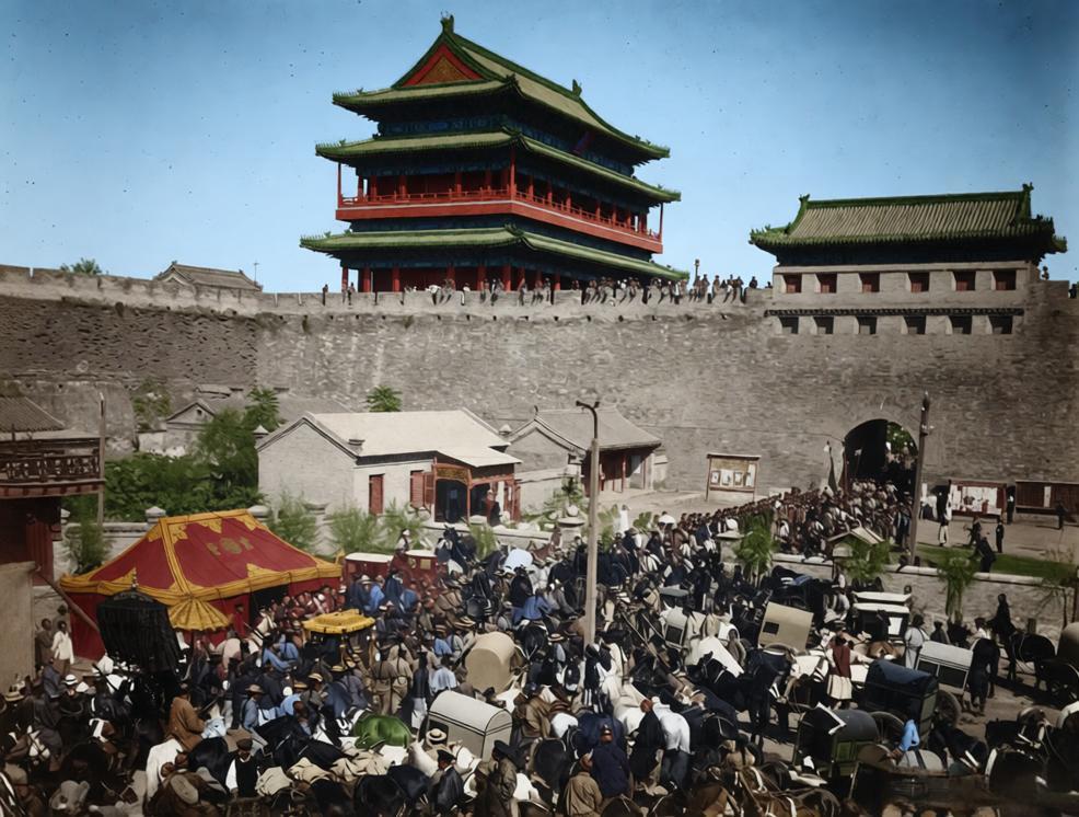 这张20世纪早期(约1903年后)由故宫博物院藏的照片,呈现的是北京城南正阳门(前门)的实景。 作为北京内城规模最大的城门,正阳门在1900年八国联军侵华时遭炮火焚毁,1903年经袁世凯主持修复;城墙上聚集着观景人群,城楼下则是城南的繁华市井,传统马车、轿子、人力车与早期汽车混杂其间,既延续着老北京的烟火气,也显露出清末民初城市从传统向近代转型的新旧交织特质。