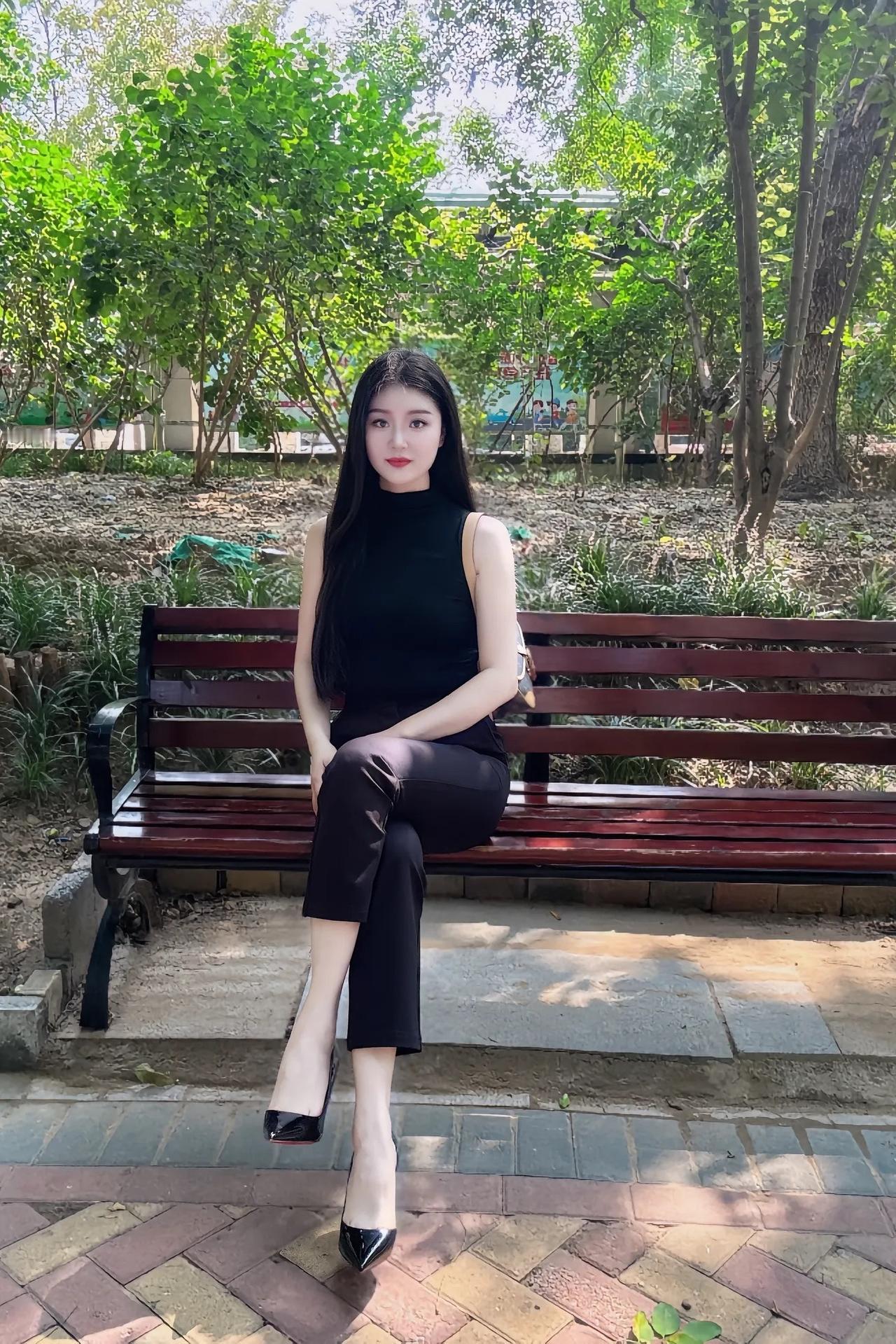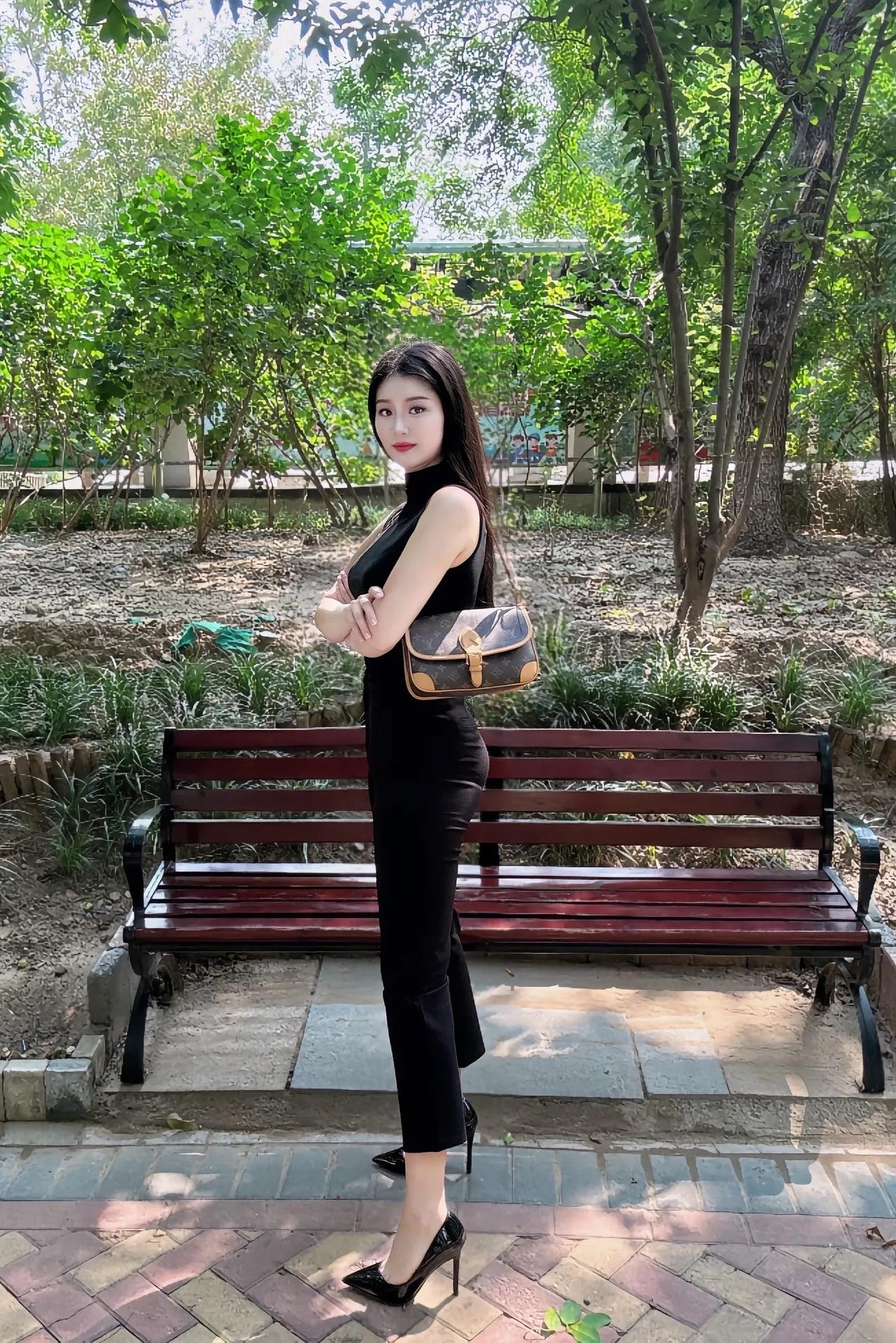 冬夏日午后,绿意盎然,黑裙红椅,优雅动人。