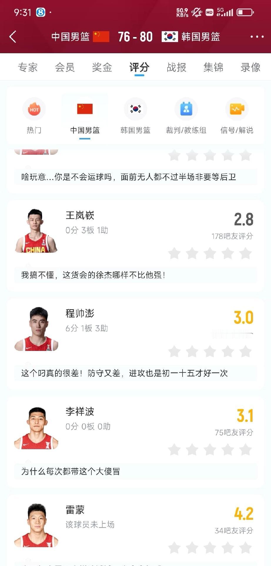 中国男篮负韩国,赛后球员评分出炉~ 外线太差了!最后三分半才缓过神来,让对手进了那么多三分,周琦的罚球依然很菜,想赢怕输,比赛一开始就心里负担太重,好几个绝对必进球都打飞了!