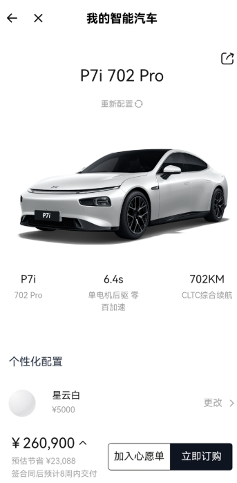 小鹏P7i该怎么选颜色? 原本定了星际绿,但是感觉不耐看,选的是18寸轮毂,现在在路上看到白色的,感觉白色很好看,也很耐看,又想把轮毂改回19寸,但是销售告诉我从新改配置需要从新排产,又要从新等8周,0328定的,原本节后可以提车了,又不想等,兄弟们我该怎么办?