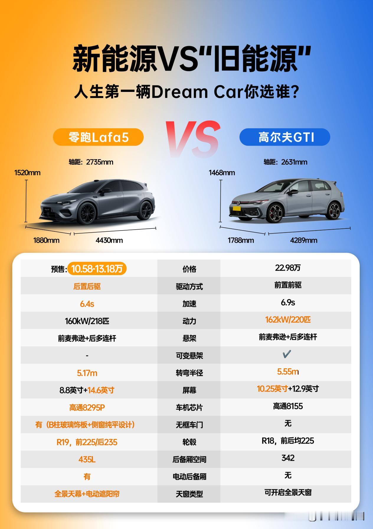 如果钢炮有段位,高尔夫GTI一定是曾经的王者,而零跑Lafa5就是新时代王者! 要说全球汽车市场最著名的两厢车,大家第一反应无疑是高尔夫,而要说堪称王者的两厢钢炮车型,那就是高尔夫GTI。不过这是在传统燃油车时代,当来到新能源时代,钢炮领域的王者应该是刚刚上市的零跑Lafa5了,因为后者可以就看做是一款“电动高尔夫”。 首先零跑Lafa5是一款全球车型,这个身份注定它会注重品质,另外就是高尔夫GTI有的在这台纯电轿跑身上也都能找到。比如性能,得益于160kW高功率电机应用,使其百公里加速低至6.4秒,而高尔夫GTI官方成绩为6.9秒,并且零跑Lafa5还是后驱布局,拥有5.17m的转弯半径,这说明操控性也会略胜一筹。 而当下年轻消费者关注的智能化,零跑Lafa5给到8295P座舱芯片,拥有双AI语音大模型,并配备激光雷达+8650智驾芯片+端到端辅助驾驶系统,确保人车交互和智能安全均达到业内主流水准。此外从颜值来看,零跑Lafa5拥有无框车门、19英寸运动轮毂+前后鸳鸯胎,以及运动包围套件等等。 关键是价格更低,目前新车限时惊喜价9.28万起,高尔夫GTI则需要22.98万元,如此差距对年轻人来说真没什么可犹豫,人生第一辆运动钢炮选零跑Lafa5错不了!