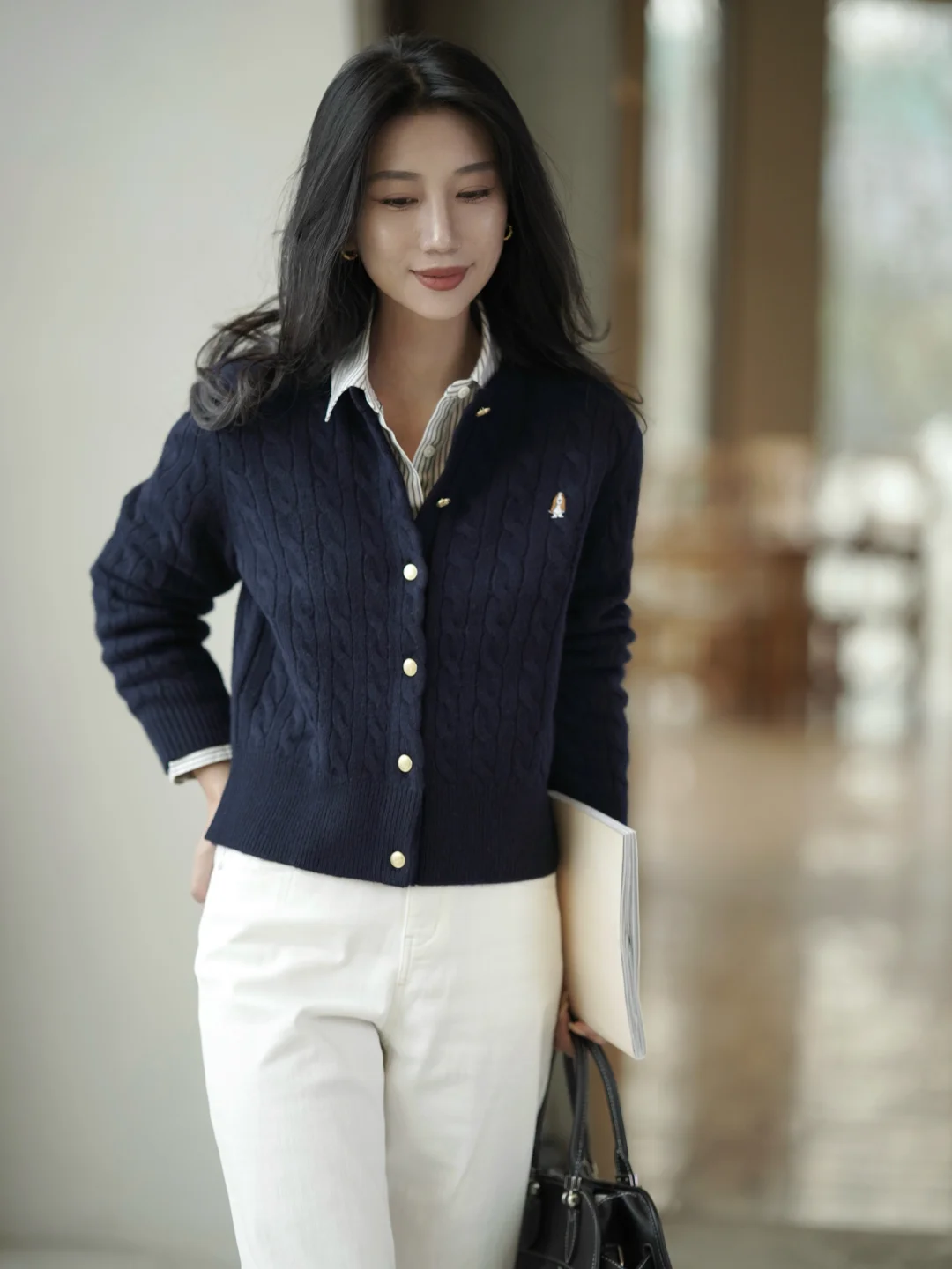 那件深蓝色的纽花毛衣,是老朋友了。粗砺的羊毛纹理裹着体温,像一层温厚的铠甲,抵御着季节的清寒。里面一件蓝白条纹衬衫,领口与下摆不经意地露出,褪去了所有的板正,只剩下洗练过的书卷气。