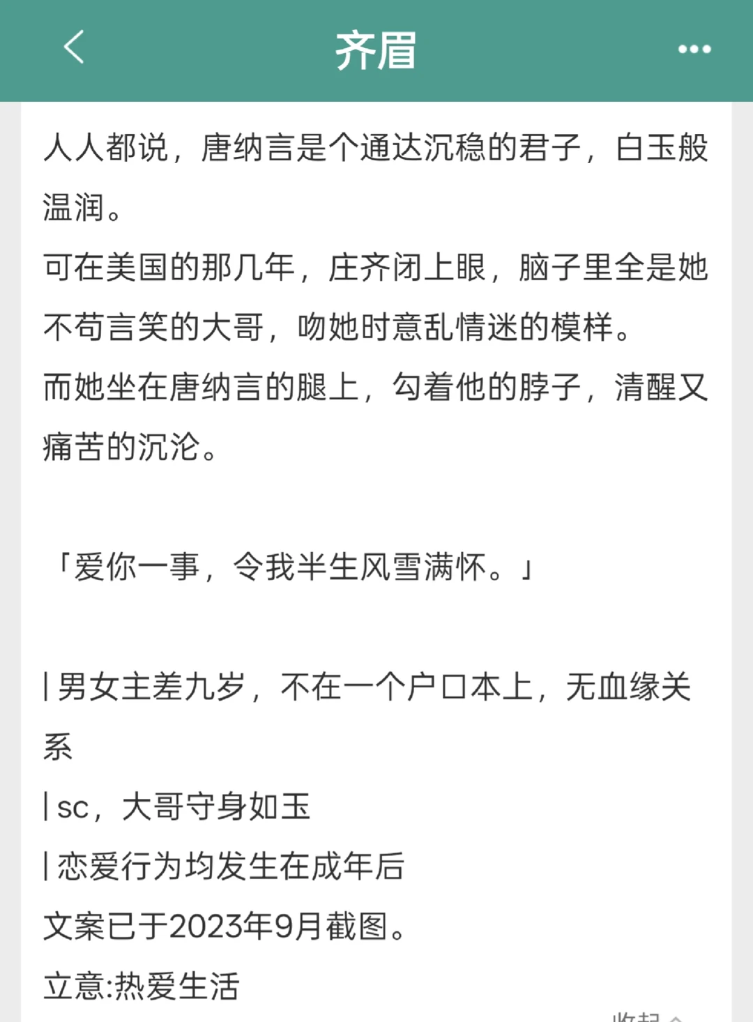 寄养长大的乖乖女遇上温柔又护短的“大哥”,九岁年龄差藏着克制的深情。分开五年再重逢,他撕破伪装强势追妻,这场破镜重圆的拉扯,读着又甜又上头~