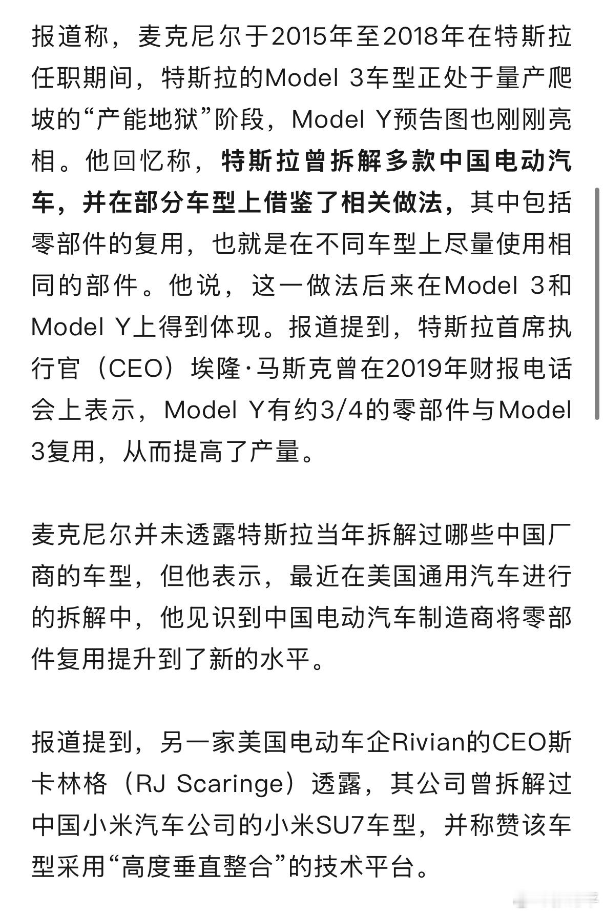 特斯拉被曝曾拆解中国电动汽车划重点,麦克尼尔回忆的是2015年至2018年,特斯拉曾拆解多款中国电动汽车,并在部分车型上借鉴了相关做法。然而那个时期的中国电动车其实还没完全成熟,但已经引起足够重视了。再看现在……如果我是特斯拉,我觉得每年都有很多值得拆一拆的。不过这也是行业普遍方法,大家都在拆,都在研究和学习,倒也不是什么大惊小怪的事。新能源汽车