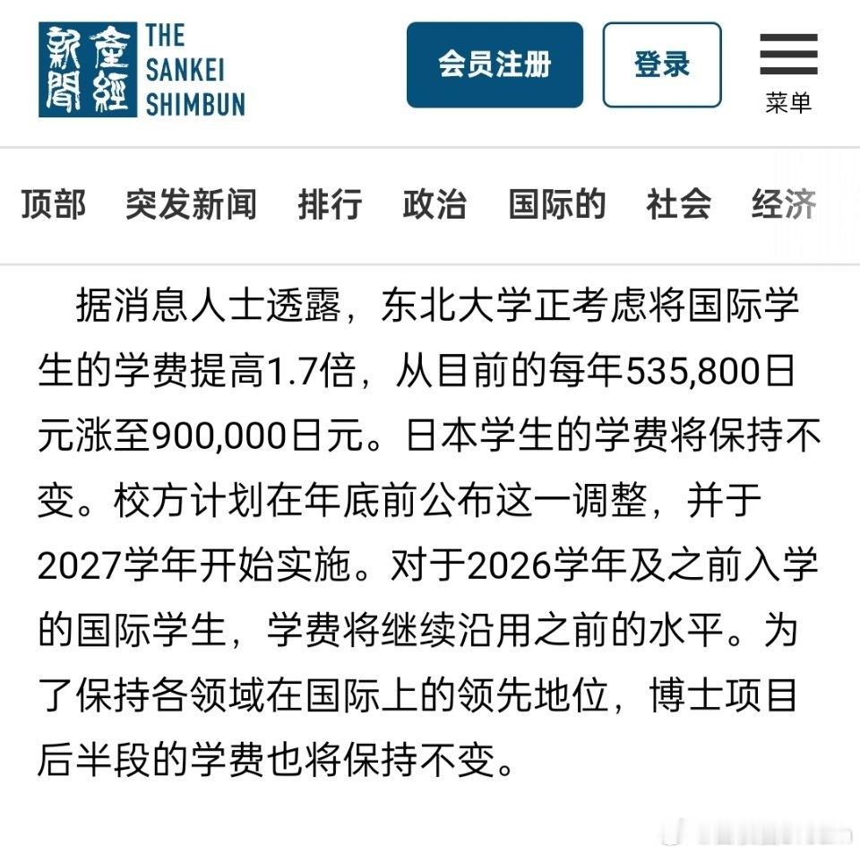 🔻日本东北大学将国际学生学费提高70%🔻这是日本国立大学首次对外国留学生和日