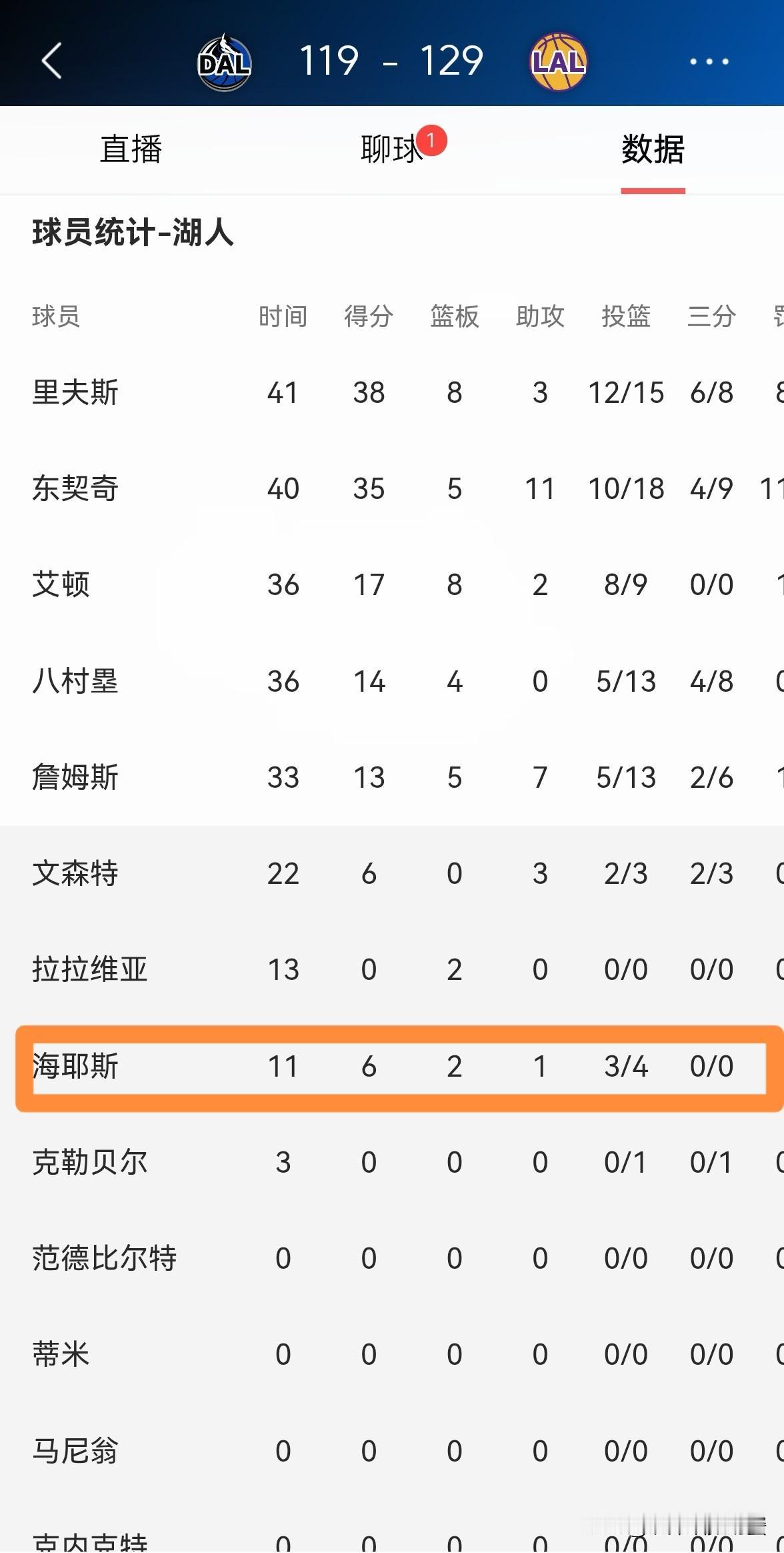 湖人年轻中锋海斯真为球队的替补争气!在今天湖人主场以129:119击败独行侠的比赛中,海斯替补出战11分钟,投篮4中3得到6分2篮板1助攻1盖帽。值得一提的是,本场比赛湖人的替补合砍12分,而海斯独得6分,成为了球队替补阵容中得分并列最高的球员。 坦白说,如果不是海斯在替补出战后得到6分,我相信湖人的替补阵容一定会在赛后遭到一些球迷的狂喷。