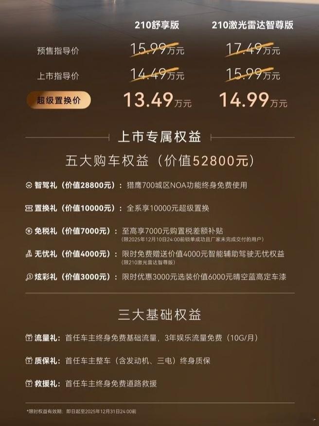 上市3小时,锁单5k+?星途et5 这波能成吗?先看价格,首购是14.49-15.99万元,置换是13.49-14.99万元,高低配差价一万五,配置区别包括:主驾膝部气囊地平线J6P+HSD智驾(猎鹰700)前排夹胶+后排隐私玻璃外后视镜记忆+倒车自动下翻四音区语音交互、面部识别前排通风/加热/按摩主驾记忆+4向腰撑+头枕扬声器副驾高低可调+腿托+老板键5G网络+256色氛围灯21扬索尼音响+主动降噪独享选装20吋马牌轮胎(2988)其中座椅、音响、氛围灯、麂皮顶棚这一套,低配花5888也可选装,相当于分出了一个溢价不到一万的高阶智驾顶配,一个可买的中配,和一个🐶都不买的丐版如果对智驾无刚需,将将超过14万的中配就足够了,毕竟是增程大五座,除了后排配置有点拉胯,其他没什么短板如果是高阶智驾刚需,HSD目前的水平也是妥妥的行业前五,绝大多数情况下用起来都没问题,而且560TOPS算力决定了这套系统不会年抛,在L2+的框架下支撑3-5年OTA不成问题这确实是星途少有的,能把性价比摆在明面上的产品,尽管设计上还是老毛病,但底子成熟、增程大电、智驾不落后,性价比还是可以的大v聊车SUV大百科