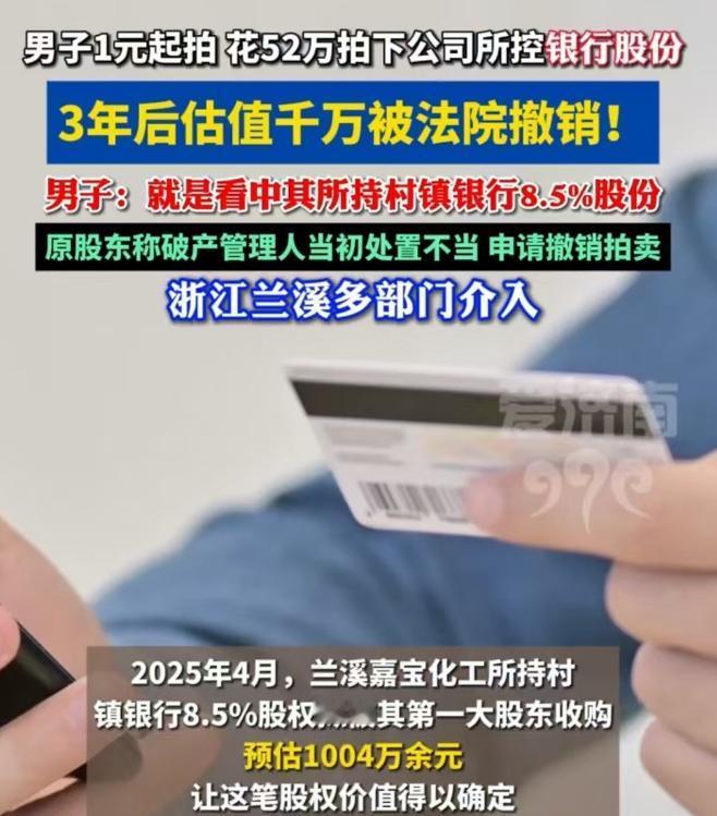 浙江金华,一男子52万元拍下一家破产公司全部股权,3年后意外发现其中持有的村镇银行8.5%的股份价值超千万,可还没等男子兑还,就被法院给裁定收回了…… 事情发生在2022年12月,钱先生从网上发现兰溪市嘉宝化工有限公司正在进行破产竞拍,竞拍起步价仅1元。 钱先生常年参加拍卖活动,一眼就看中了这家公司持有的8.5%的银行股份,在他看来,这份股权迟早会有盈利的时候。 于是,他如期参与了竞拍,并且为此准备了200万元的竞拍资金,不料,到最后经过698轮的加价,钱先生直接以52万元的价格就竞拍成功了。 不过,这份股权在当时并没有多少价值,也就没有太多人关注。 可就在三年之后,钱先生找了专业人士评估之后发现这些股份的价值超过了1000万元,钱先生十分激动。 然而还没等他吃下这个红利,就收到了法院的裁决书。 原来,该公司的原始股东之一徐先生也发现了股份的巨大价值,当即以拍卖不合法为由向法院提起了诉讼,法院随后支持了徐先生的诉求,收回了钱先生经过拍卖获得的股权。 钱先生得知结果后十分愤怒,在他看来,这是经过合法渠道公开竞拍获得的,法院无权直接收回。 然而,法院给出的理由是这次竞拍本身就不合法,因为该股份的实际价值远远超出了竞拍金额。 那问题是当年为何没有人出来制止这次竞拍呢? 钱先生当即把自己的遭遇发到了网上,果然引发了网友的热议,绝大部分网友都支持钱先生继续维权,目前当地有关部门已经介入调查。 根据有关工作人员所述,钱先生的拍卖的确是合法的,如果是司法过程存在违规行为,那他可以申请国家赔偿,而如果是破产管理人的责任,他可以直接起诉破产管理人。 只是这份股权恐怕和他没有多大关系了,钱先生空欢喜一场。 对此,大家又是怎么看的呢?