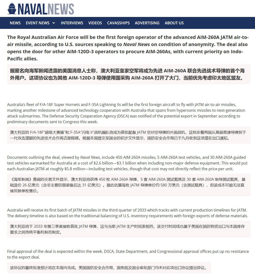🔻澳大利亚将成为首个获得 AIM-260 的海外国家。🔻450枚AIM-260A导弹、5枚AIM-260A试验弹和30枚AIM-260A制导试验弹,总价值26亿美元。🔻580万美元一发,要到2033年才能拿到第一批。🔻via Navalnews热点现场海外新鲜事