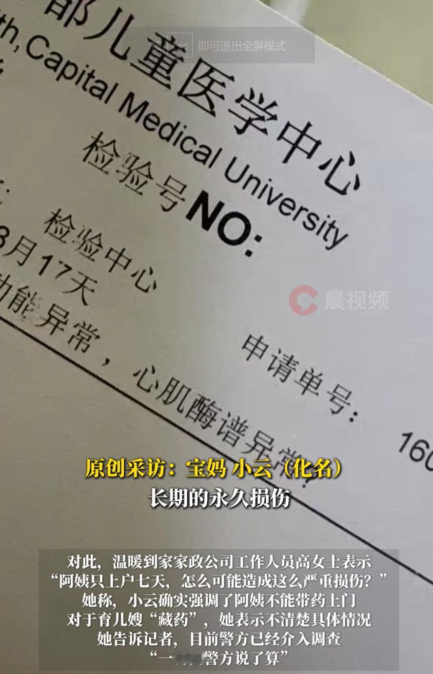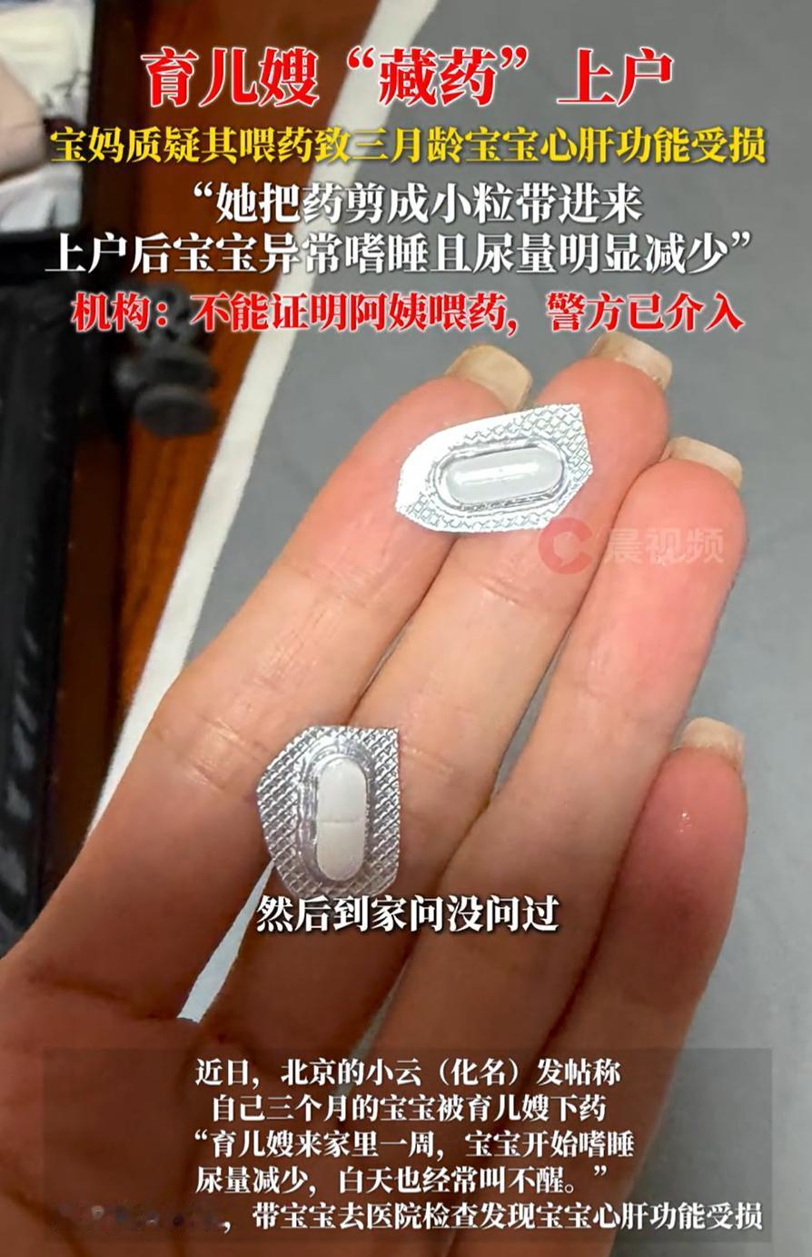 北京,一女子花9000元请了一个育儿嫂,可对方没来几天,女子就发现三个月的宝宝白天开始嗜睡,后来去医院检查,还查出心肝功能受损,女子怀疑,这是育儿嫂“藏药”上门了!机构回应:有药也不能证明阿姨喂药 孩子的妈妈介绍,孩子三个月大,为了减轻自己压力,也让孩子更好的成长,就在家政机构找了一位月嫂,每个月是9000块钱 值得一提的是,对方在上户前,妈妈就刷到过有育儿嫂给孩子吃药的新闻和报道,所以进门时特意检查了阿姨的行李,甚至就差内衣没检查,本以为万无一失,但还是出了问题 阿姨上户一周后,妈妈发现宝宝白天睡觉明显增多,而且有时候都叫不醒,尿量也开始变少,于是妈妈又一次检查了阿姨的行李,这次发现了三颗剪成小粒的西替利嗪,可阿姨却解释说这是自己吃的过敏药 妈妈还是不信,又带孩子去医院做了检查,发现孩子身体也出现了问题,这让她更加确信了心中想法 对此,家政机构却是另一番说法,他们认为阿姨才上户7天,不可能会对孩子造成这么大损伤,现在已经报警,等着介入调查 说实话,这件事让人最难受的不是有没有喂药,而是那种作为家长的无力感。花钱请专业服务,本意是让孩子安全、让自己轻松一点,可一旦出事,家长第一时间想到的永远不是讲道理,是怕孩子被伤害。就算最后查出来阿姨没有任何问题,这段怀疑的过程也够折腾人 一个孩子三个月大,他不会说话,不会反抗,哪怕身体有点不舒服,都只能靠大人观察。对宝妈来说,任何不对劲的苗头都不是小事。她的紧张来源不是多疑,而是一种本能的护娃心理 孩子身体出了问题,真相需要专业调查才能下结论,但这段经历已经足够提醒很多人,家政服务不是光看价格,更不是只看人顺眼不顺眼,行业规范、健康检查、上户记录、监管方式,每一项都该做到明明白白 育儿嫂藏药上门 宝宝嗜睡被质疑喂药