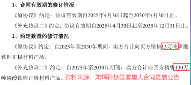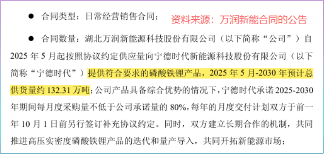 2025年5月19日,万润新能与宁德时代签订132.31万吨磷酸铁锂长协;6月2日,龙蟠科技与亿纬锂能签订15.2万吨磷酸铁锂长协。