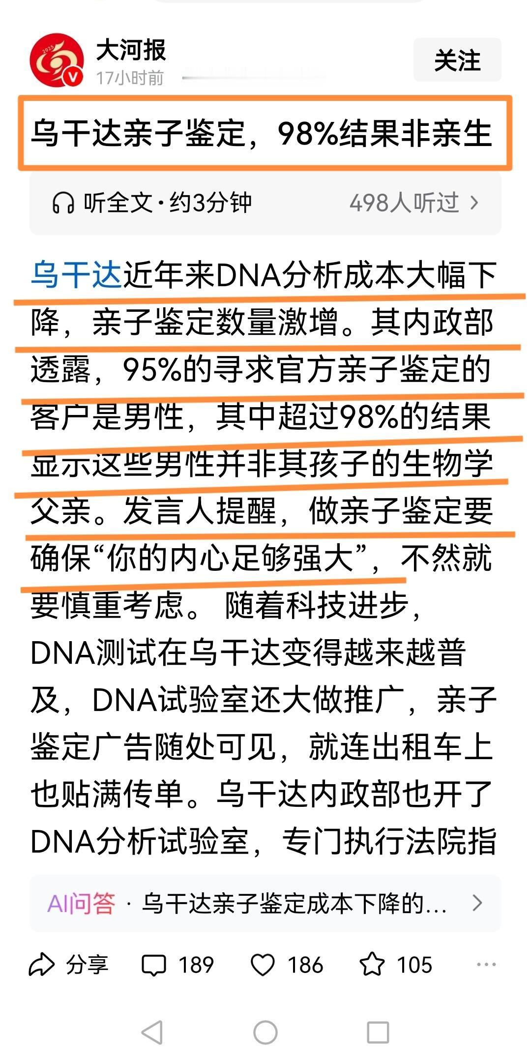 差一点误会了!刚看到一篇新闻:《乌干达亲子鉴定,98%结果非亲生》,占比吓人,以为这个国家做亲子鉴定的,基本上都不是自己孩子。 但仔细一看标题下面的内容,感觉媒体有点带节奏了。 并不是乌干达98%的爹都在替别人养娃,而是那些已经怀疑孩子不是亲生的、主动跑去验DNA的男性里,98%的猜测被证实了。 说白了,这数据是“怀疑人群”的统计,不是全民普查。就像医院体检查出一堆病人,但不能说全社会都是病人吧? 为啥乌干达男人突然扎堆验DNA? 主要是以前检测太贵,普通人验不起,现在DNA普及率高了,价格打下来了。而且当地传统观念里,血缘特别重要,男人发现孩子不像自己就容易瞎想。现在技术给了答案,结果一验一个准,反而加剧了信任危机。 很多乌干达男性是带着“实锤”心态去验DNA的,结果98%的人猜对了。说明啥?日常的怀疑不是空穴来风——可能孩子长相、妻子行为早就有端倪。但反过来看,如果婚姻要靠一张报告维系,这关系本身已经凉了一半。 新闻里95%的鉴定者是男性,难道女性不怀疑?其实在男权社会,女性往往没权利质疑孩子血缘,甚至被查出非亲生后可能面临家暴、离婚。技术解放了真相,但没解放弱势群体。 人这一生,执着于“是不是我的”很容易,难的是珍惜“已经成为我生命一部分”的缘分。基因只是生命的起点,而共同经历的日子,才是亲情真正的根基。 友友们有什么看法?欢迎评论区讨论。