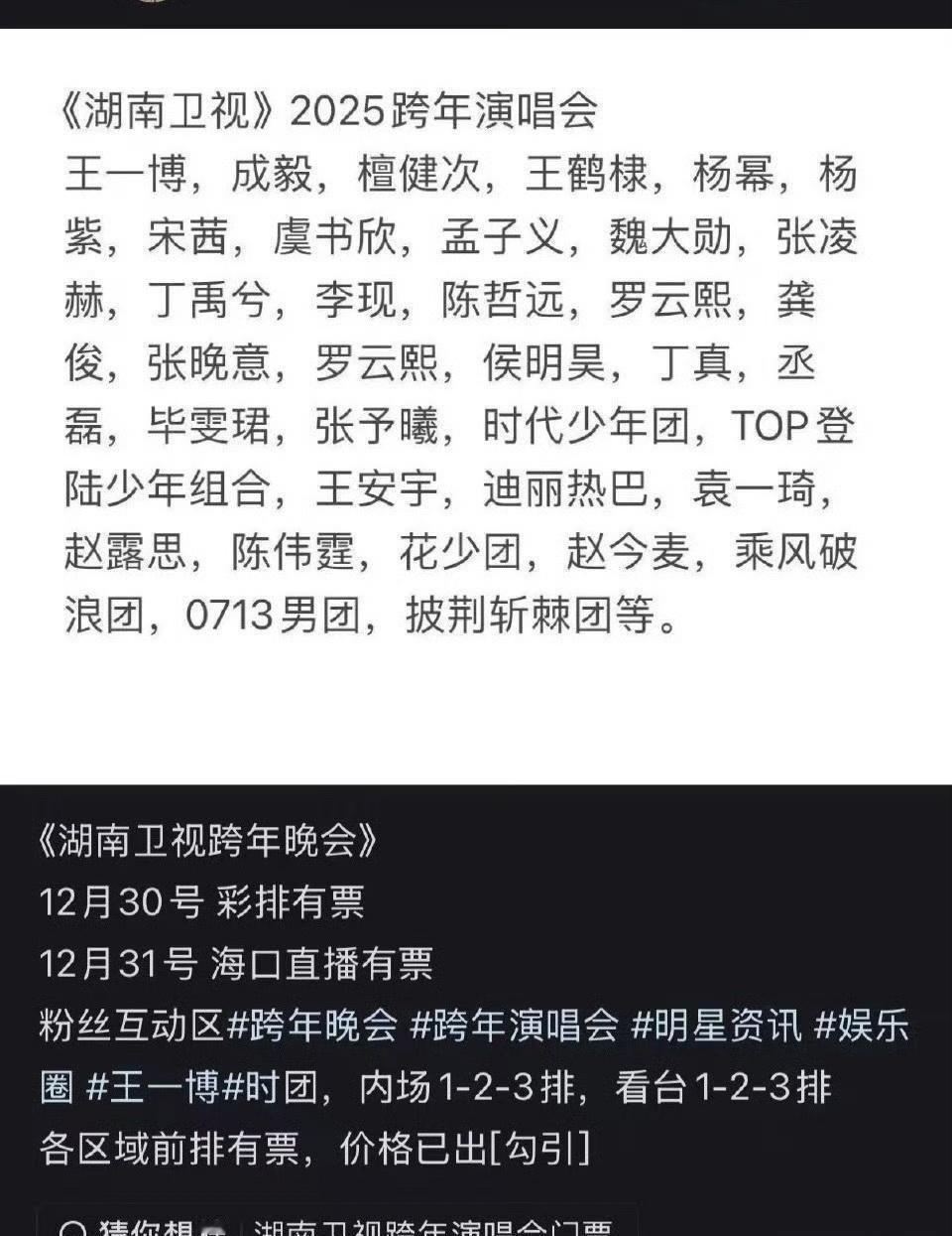 湖南卫视跨年晚会2025名单里面好多家应援色是绿色,比如王一博、侯明昊、丁禹兮和杨幂家应援色都是绿色的,各家粉丝都要小心灯牌绿海别被别人偷梁换柱了