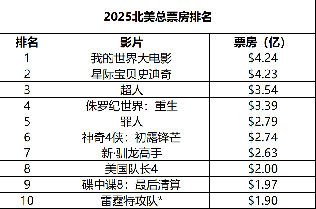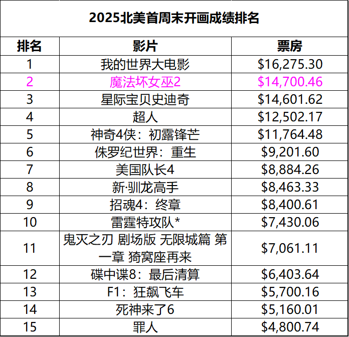 2025年第47周北美票房 :《魔法坏女巫2》开画夺冠,首周末票房排名年度第2,全球劲收2.7亿美元。(数据:boxofficemojo)