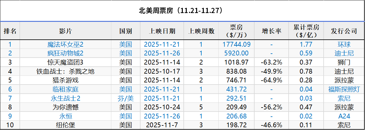 2025年第47周北美票房 :《魔法坏女巫2》开画夺冠,首周末票房排名年度第2,