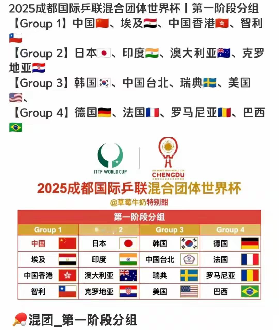 混团世界杯抽签揭晓!国乒港队同组,孙颖莎王楚钦亮相仪式 2025成都混团世界杯分组结果正式出炉!抽签仪式上,国乒人气组合孙颖莎、王楚钦亲自参与,引发全场关注。 分组形势: · 第一组:中国、埃及、中国香港、智利 · 第二组:日本、印度、澳大利亚、克罗地亚 · 第三组:韩国、中国台北、瑞典、美国 · 第四组:德国、法国、罗马尼亚、巴西 本届赛事采用小组前两名晋级淘汰赛的赛制。令人瞩目的是,中国队与中国香港队再度同组相遇!虽同组竞技,球迷纷纷祝福港队力争小组第二,携手出线。 决战在即,国乒全员蓄势待发。期待球员们的精彩表现,一起为国乒加油,向冠军冲刺!