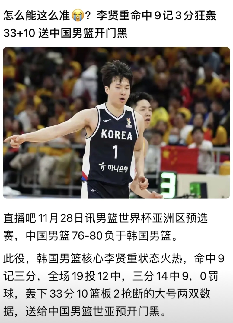 可能是主场作战,球迷众多,球员压力很大,手感太差,进攻不顺。但是防守也防不住就很奇怪了,韩国队李贤重一个人投中9个三分球,得33分,但是最关键的是他一个罚球也没有,说明了什么?