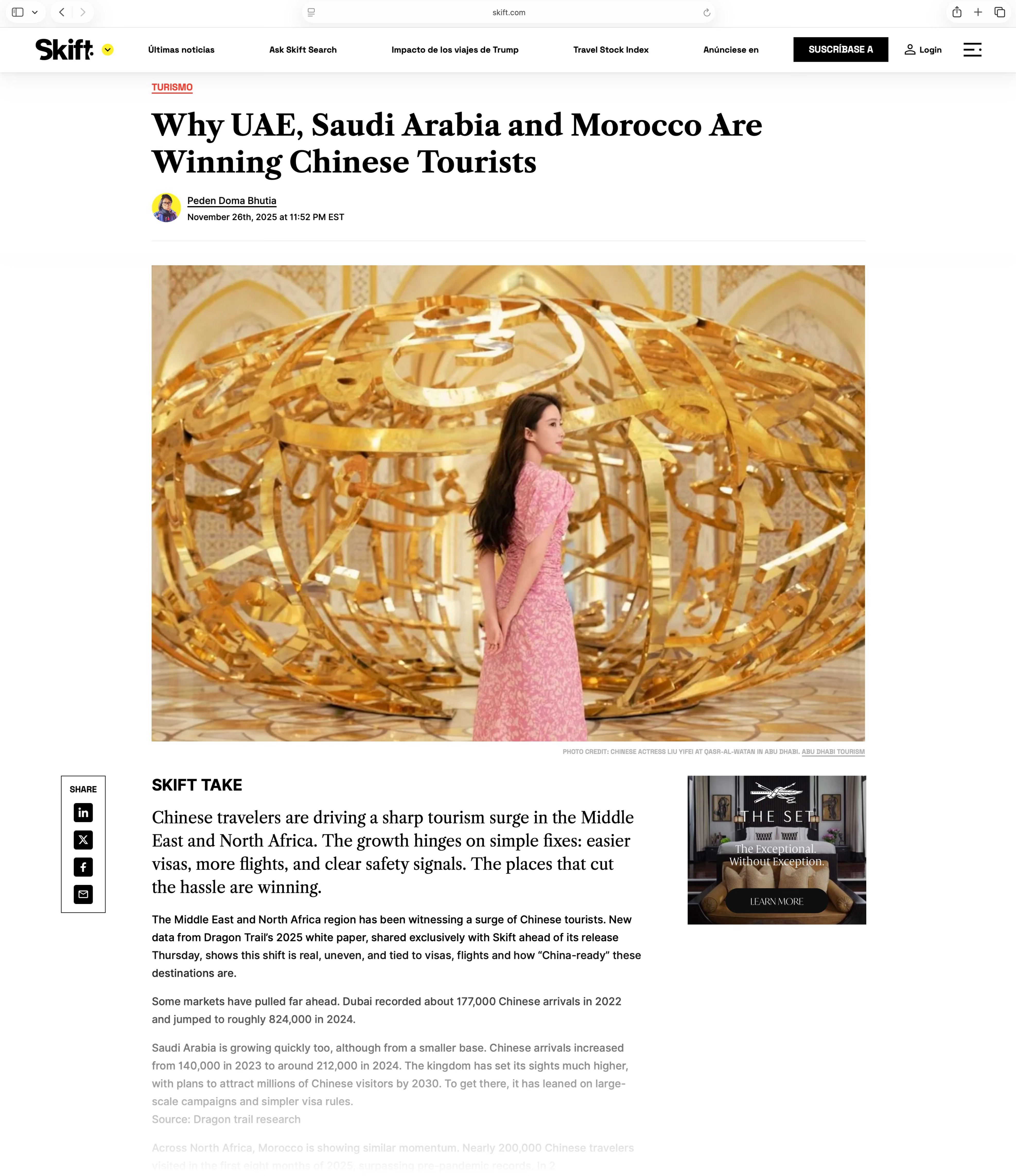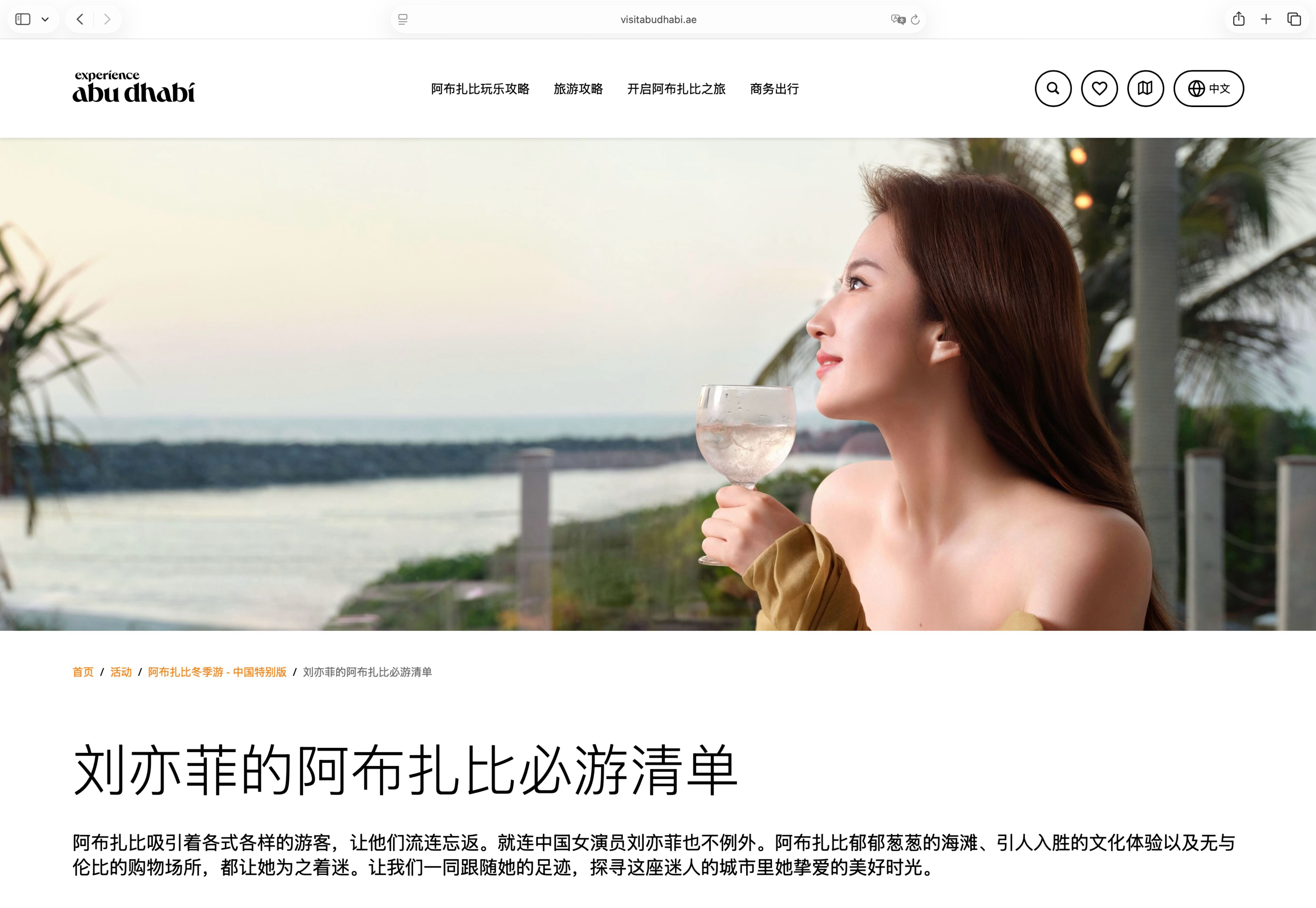 刘亦菲 全球领先的旅游行业商业媒体Skift报道以阿联酋等国为代表的中东北非地区对中国游客吸引力上升游客量激增及背后原因,报道中使用了体验阿布扎比代言人刘亦菲的宣传照,同时也附上了【刘亦菲的阿布扎比必游清单】的链接,请到做代言人真的有了刘亦菲效应的好多红利刘亦菲体验阿布扎比代言人