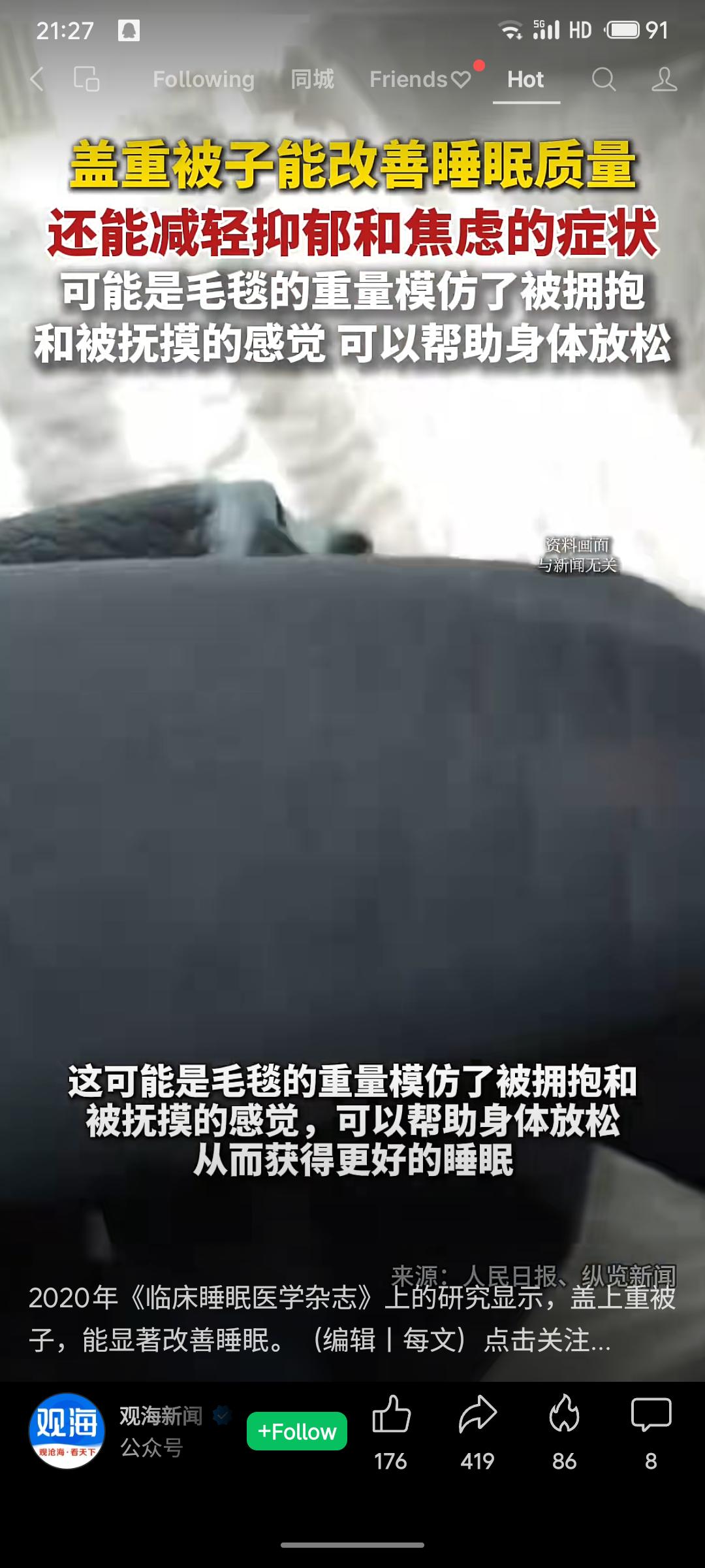 研究表明,盖重被子(约6-8千克)能显著改善睡眠并缓解焦虑、抑郁症状。其原理可能是被子的重量模仿拥抱和抚摸的感觉,帮助身体放松。实验显示,使用加重毛毯一个月后,超四成使用者失眠改善;一年后,近八成的人睡眠质量明显提升。
