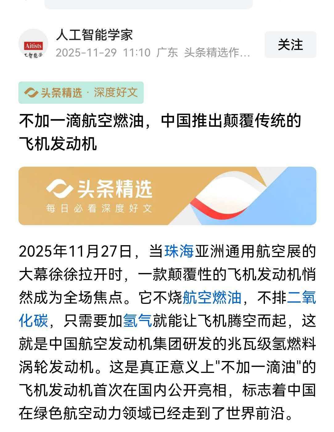 中国太厉害了![撒花][撒花][撒花] 颠覆性的航空发动机! 从此飞机不再烧油! 中国航发集团研发的,兆瓦级氢燃料涡轮发动机, 不再烧油,只需氢燃料就可以! 又是一项重大突破,外国研究几十年没成功的无油发动机, 中国实现绝对突破, 这标志着中国绿色航空动力领域走到了世界最前沿! 这次航空展,中国航发与17家客户签订了合同,价值数十亿元! 真是可喜可贺的事!!
